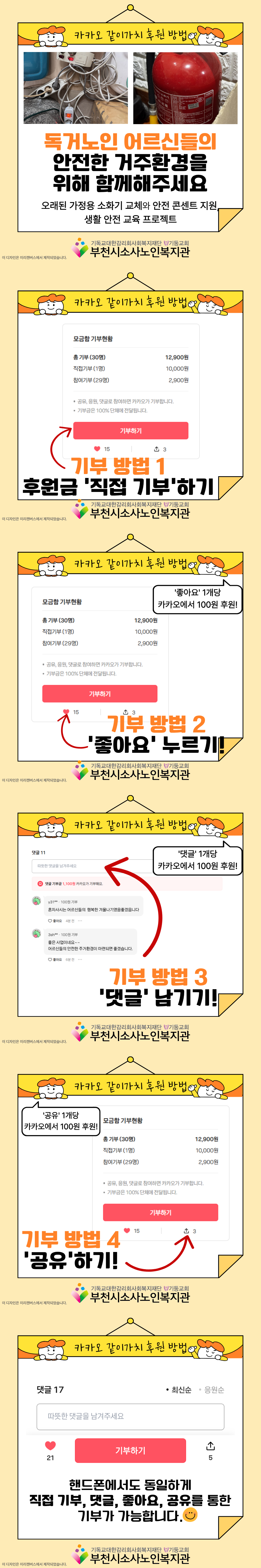 부천시소사노인복지관에서는 어르신들의 안전한 거주환경 지원을 위한 카카오 같이가치 모금함을 개설하였습니다.