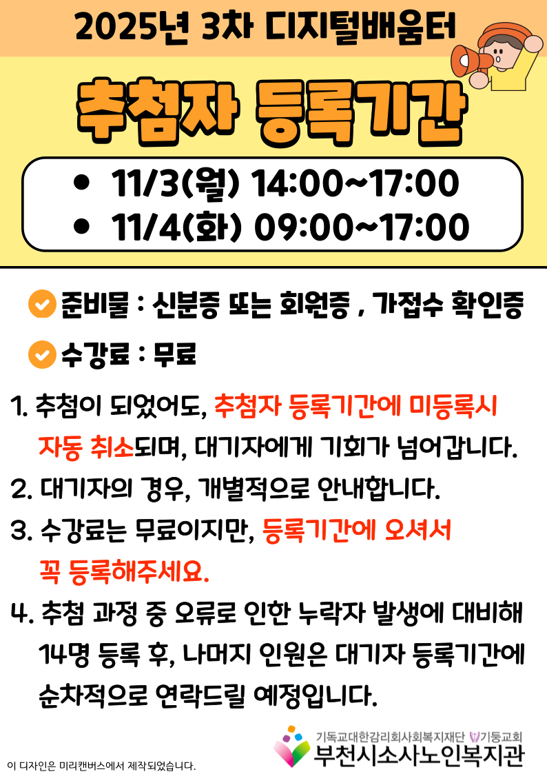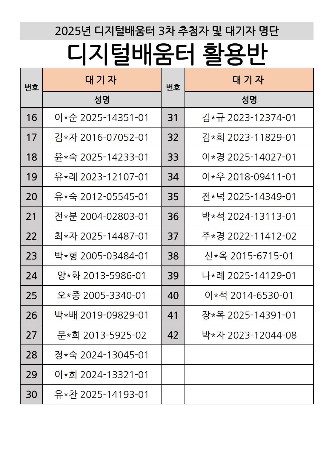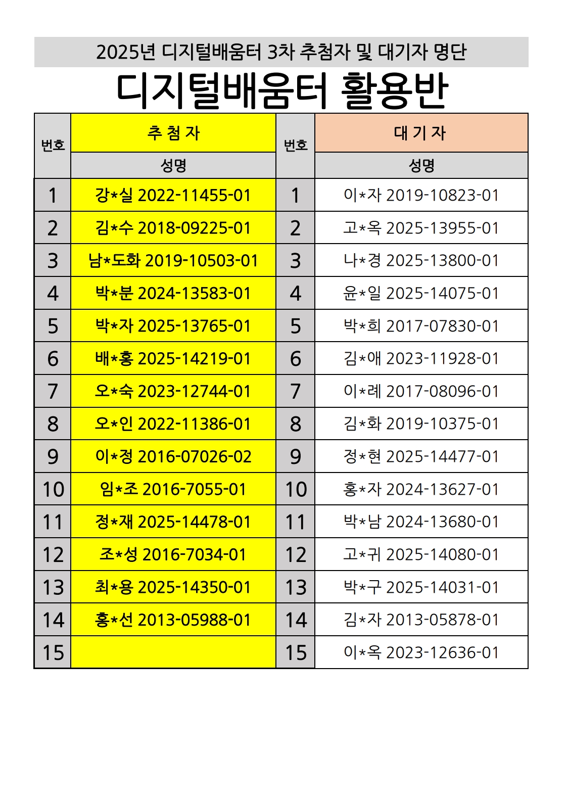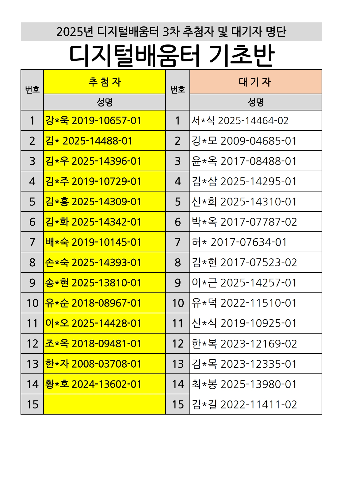 [노년사회화교육사업] 2025년 3차 디지털배움터 추첨자 및 대기자 명단