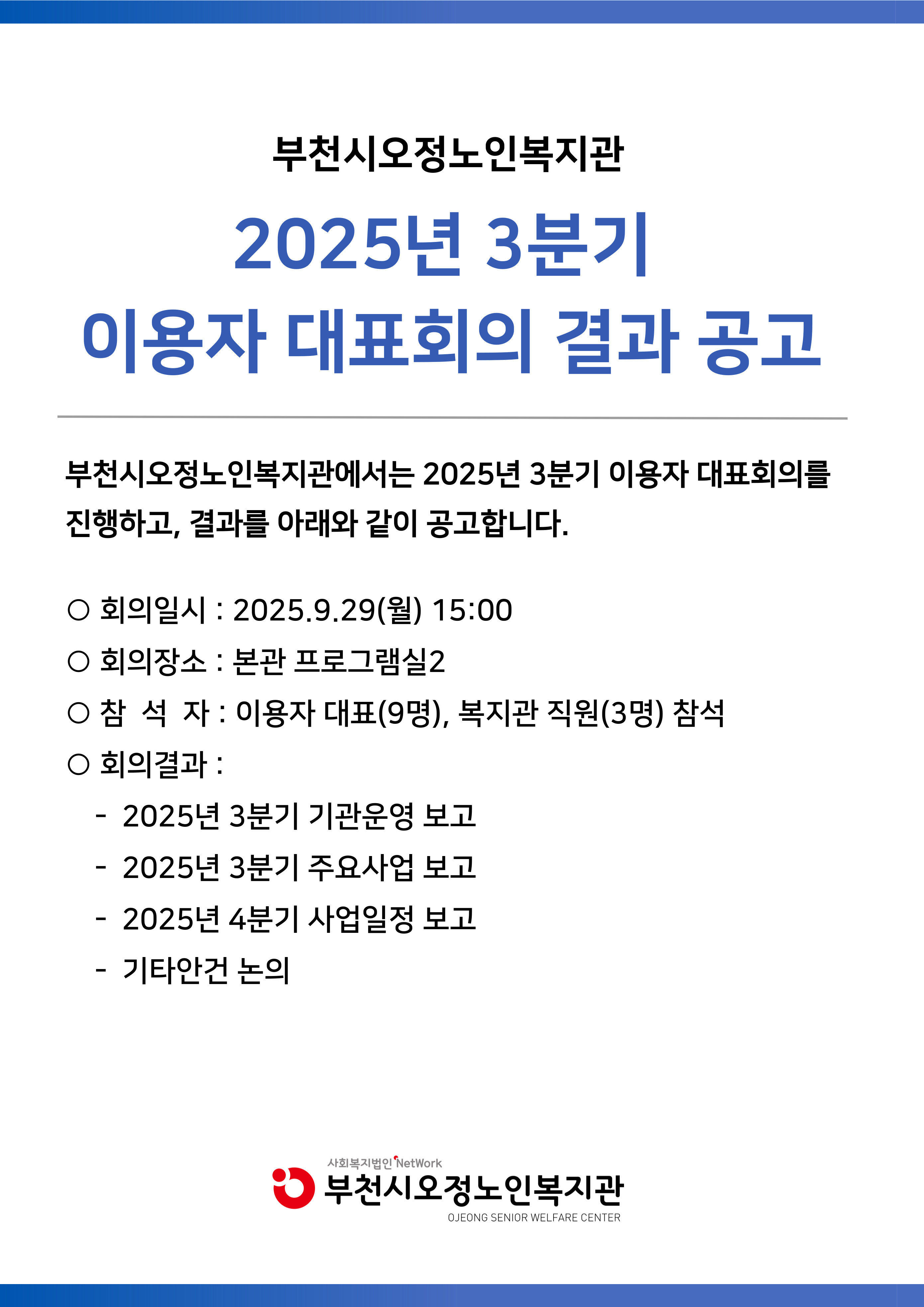 2025년 3분기 이용자대표회의에 참여해주시고, 복지관 운영에 소중한 의견을 나눠주신 이용자대표 여러분께 깊은 감사의 말씀을 드립니다.