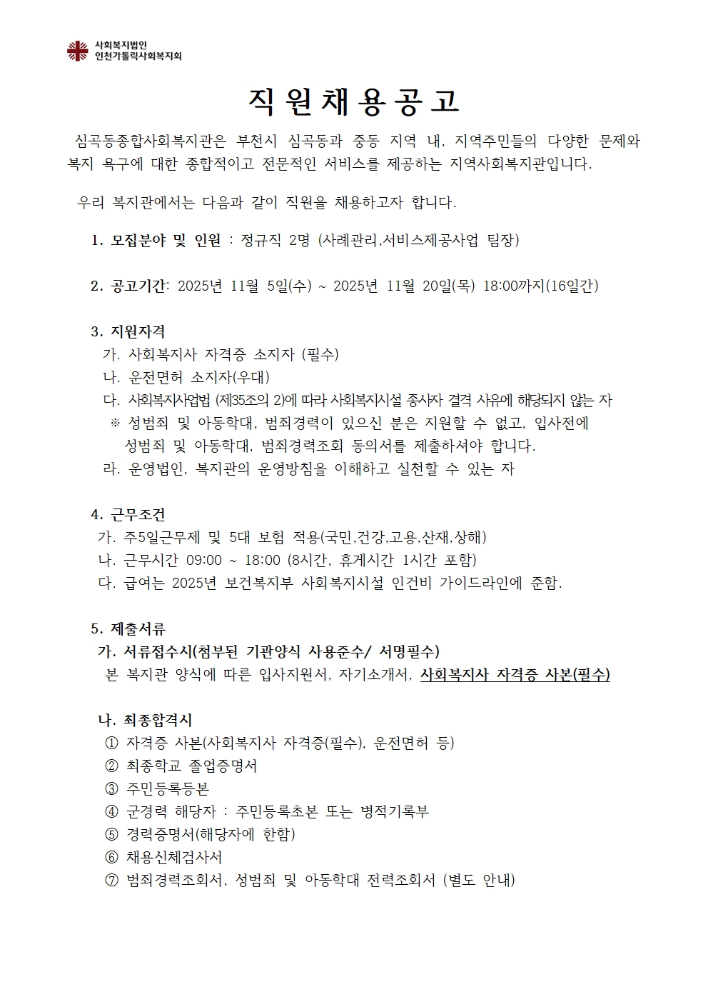 심곡동종합사회복지관 직원채용(사례관리,서비스제공팀장) 총2명