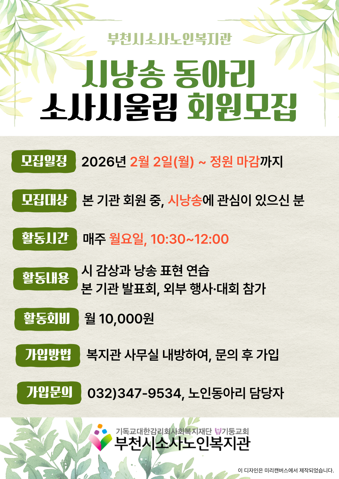 [노년사회화교육사업] 노인동아리 '소사시울림(시낭송)' 단원 모집