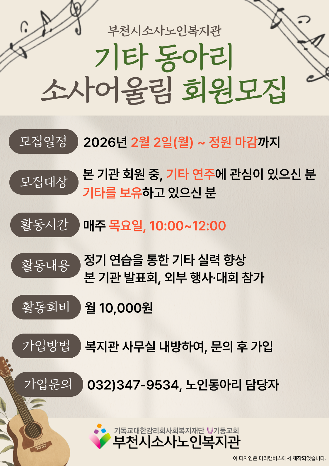[노년사회화교육사업] 노인동아리 '소사어울림(기타)' 단원 모집