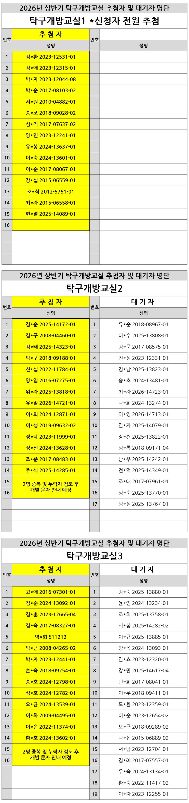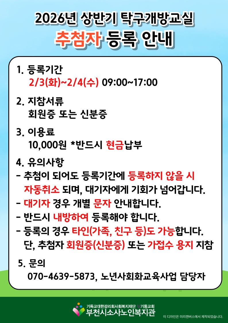 [노년사회화교육사업] 2026년 상반기 탁구개방교실 추첨자 및 대기자 명단 공개