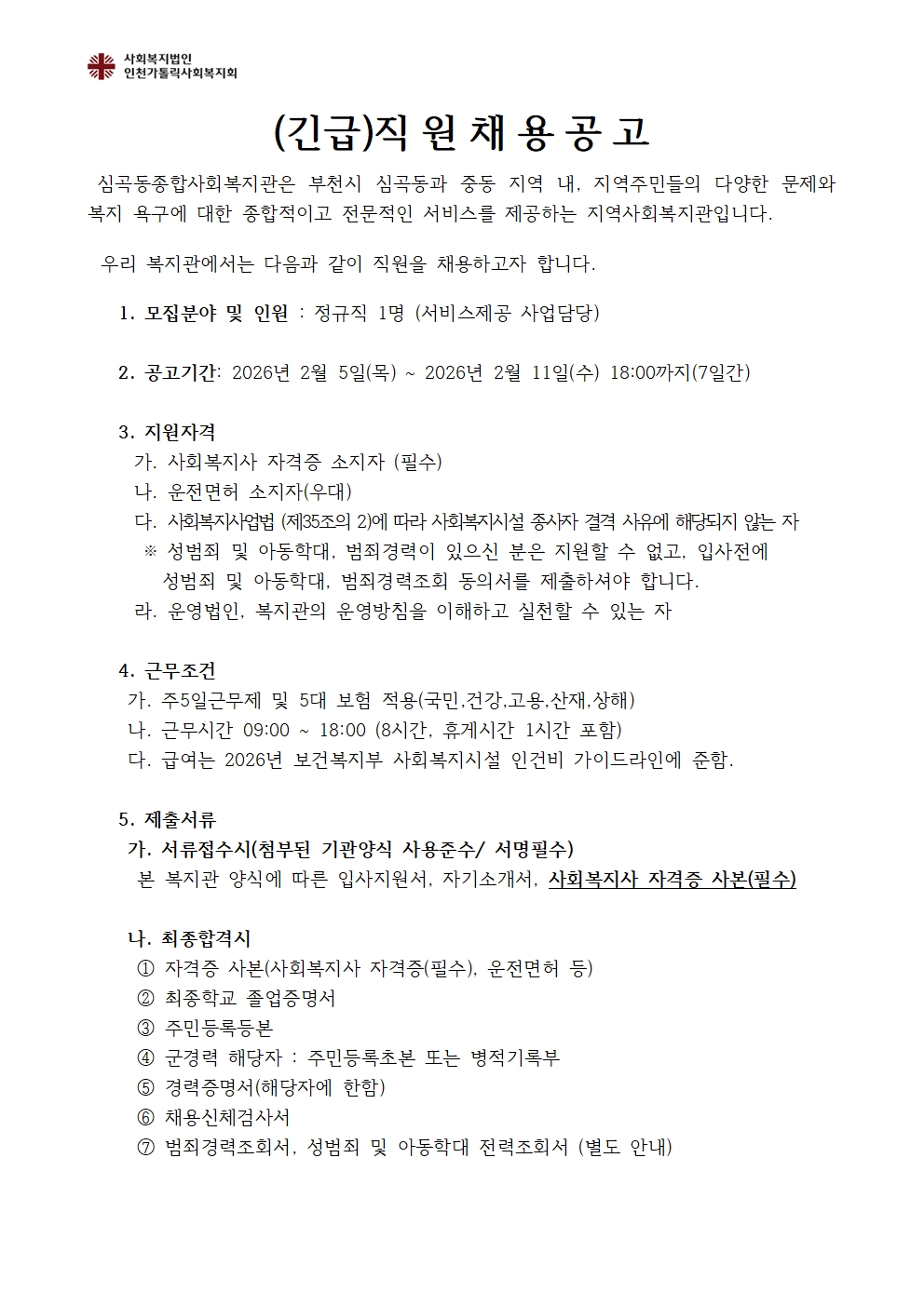 (긴급)심곡동종합사회복지관 직원채용(서비스제공팀 사업담당 1명)