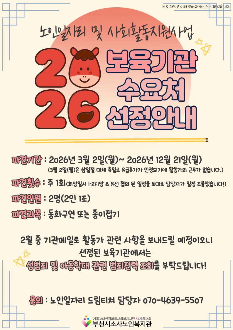 2026년 부천시소사노인복지관 노인일자리 및 사회활동지원사업 '드림티쳐' 사업의 수요처 선정 결과를 안내드립니다.