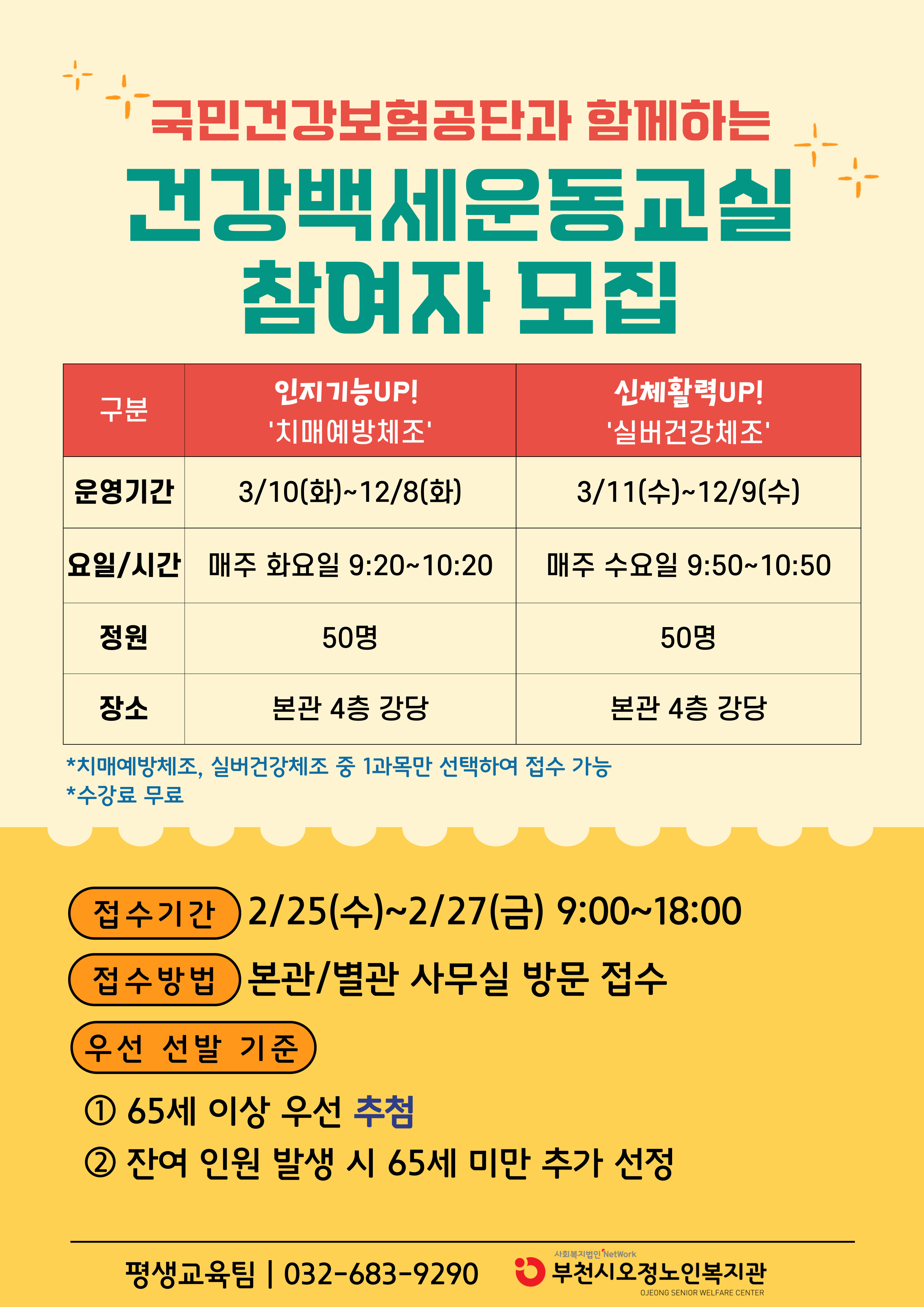 부천시오정노인복지관에서는 국민건강보험공단과 함께하는 건강백세운동교실 참여자를 모집합니다.