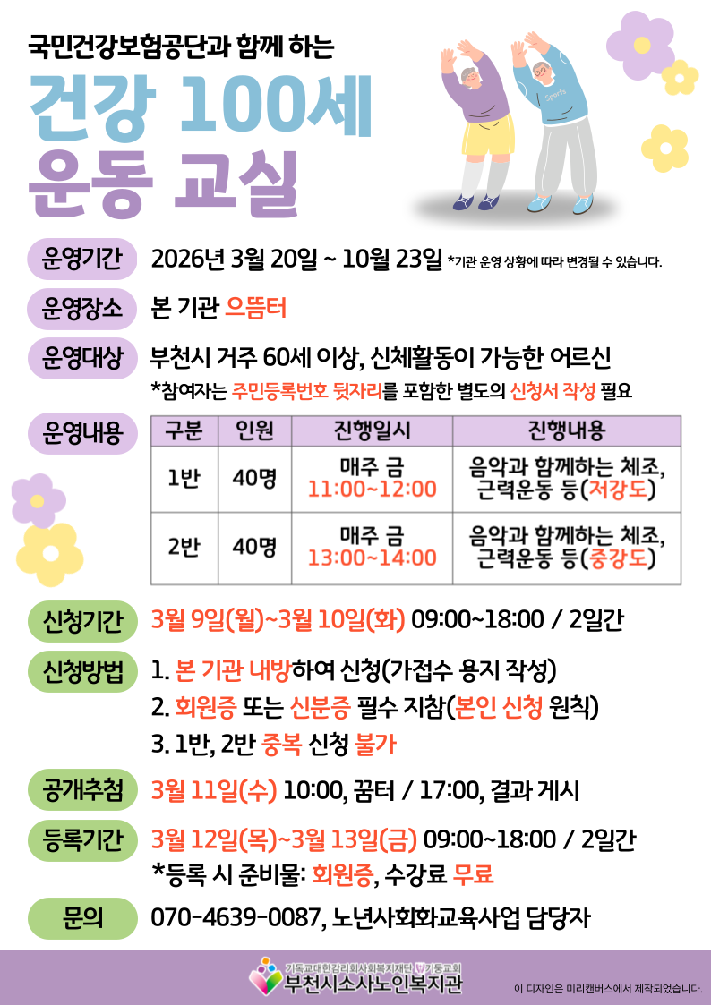 부천시소사노인복지관에서「건강 100세 운동교실」참여자를 모집하오니, 많은 신청 바랍니다