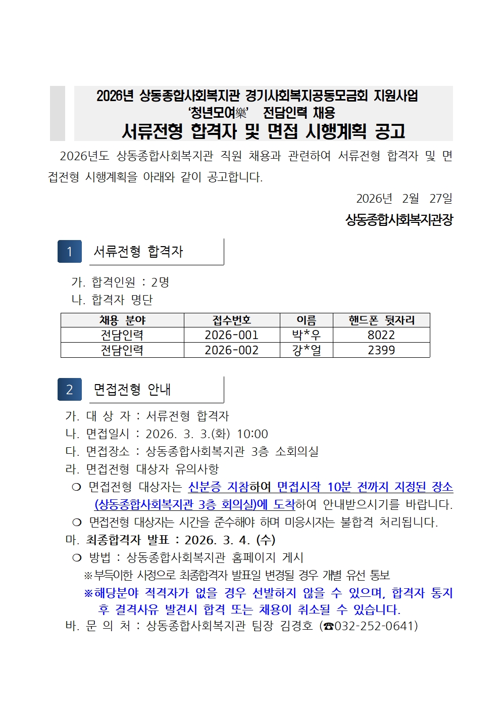 [채용서류결과발표] 2026년 경기사회복지공동모금회 지원사업 “청년모여樂” 전담인력(청년매니저) 서류결과 발표