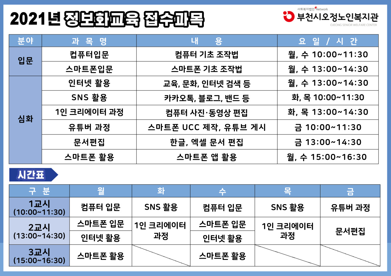 1) 컴퓨터입문 : 월, 수 10:00~11:30