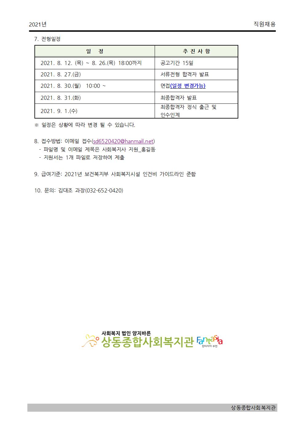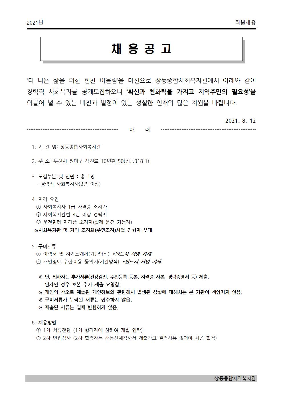 2021년 상동종합사회복지관 경력직 사회복지사 채용 재공고