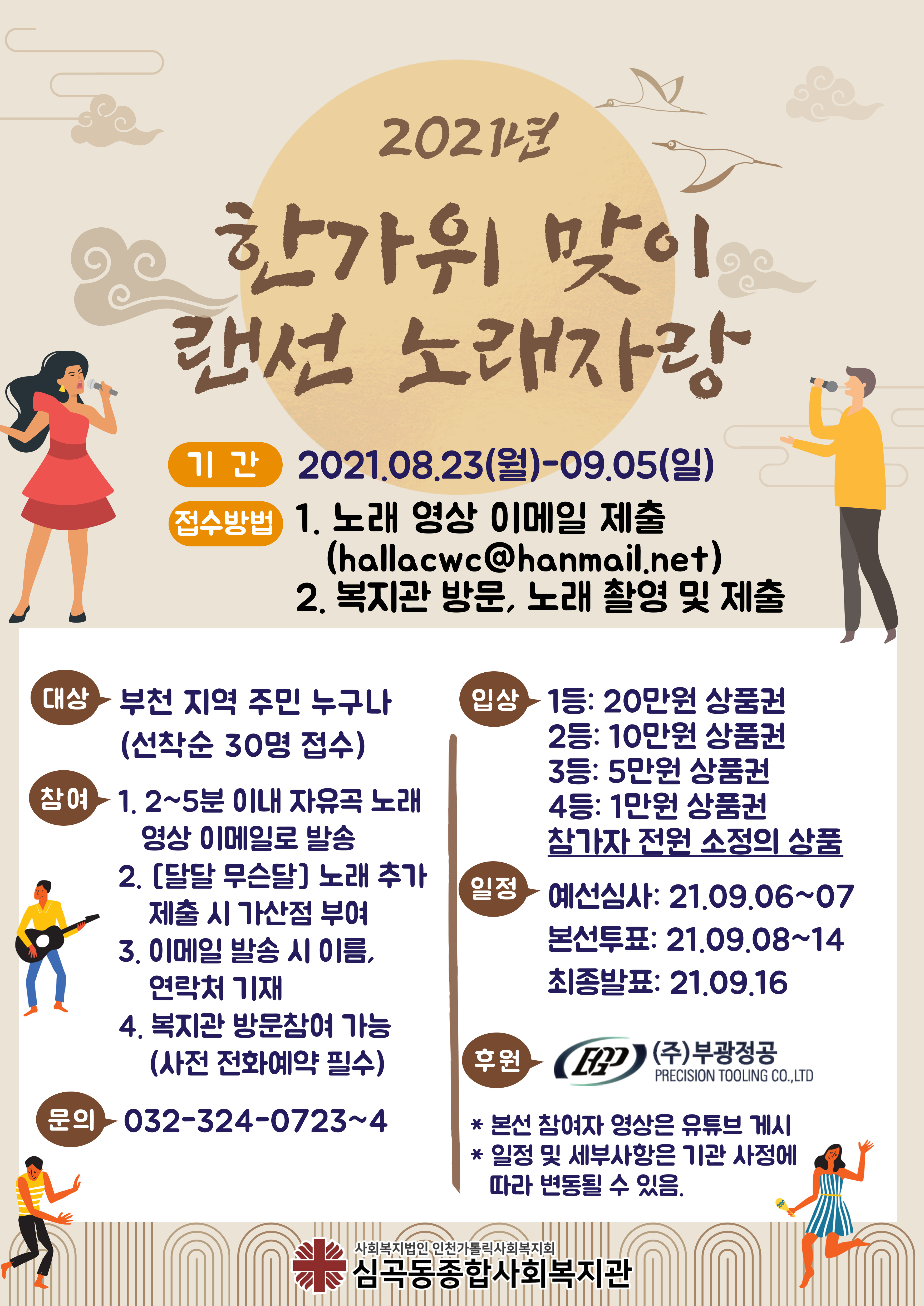 나도~ 나도~ 가수 왕!~~ 안녕하세요~ 심곡동종합사회복지관입니다. 심곡동종합사회복지관에서 한가위 명절을 맞아 색다른 행사를 준비하였습니다. 부천지역에 거주하는 주민이라면 누구나 참여 가능한!!~ 랜선 노래자랑으로 당신의 노래솜씨를 뽐내보세요~ 참여만 하여도 상품을 드리고~~ 입상하신 분들에게는 상품권을 선물로 드립니다~ 선착순 30분으로 접수가 이루어지니, 고민하지 말고~~ 신청 GOGO~!! 만약~ 직접 영상 촬영이 어려우신 분은 복지관으로 연락주시면 촬영까지 직접 해드립니닷ㅎㅎ 더 자세한 내용은 복지관으로 문의 하거나, 아래 포스터를 참고해주세요. 문의전화: 032-324-0723~4