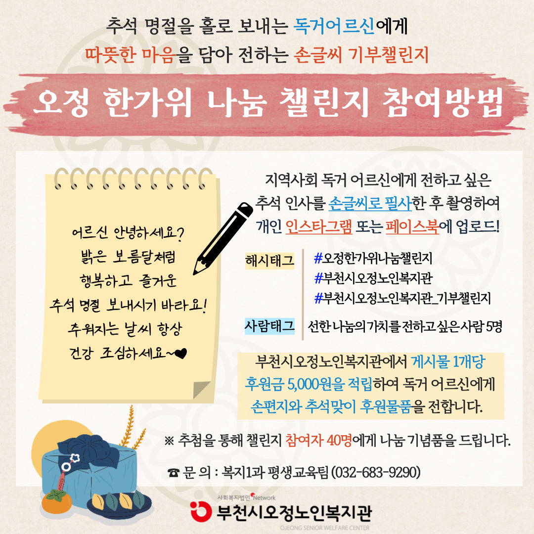 부천시오정노인복지관에서 게시물 1개당 후원금 5,000원을 적립하여 독거 어르신에게 손편지와 추석맞이 후원물품을 전합니다.