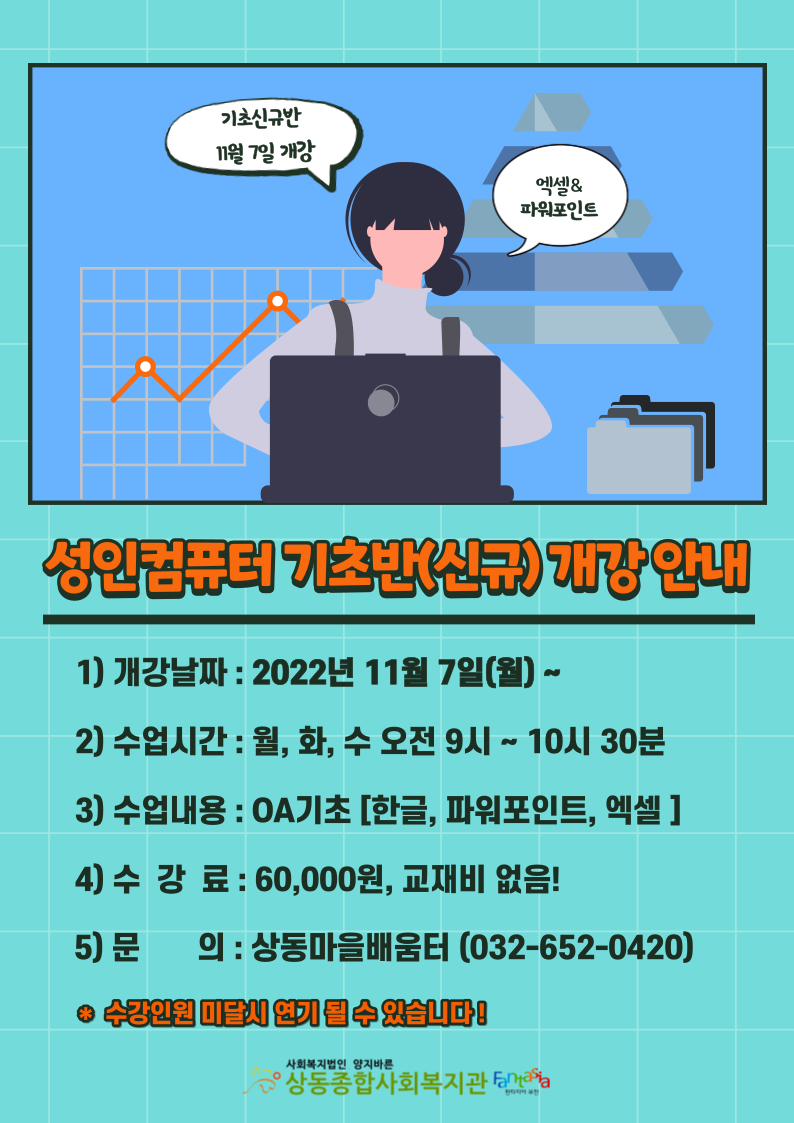 * 상동마을배움터에서 성인컴퓨터 신규기초반을 개강합니다.