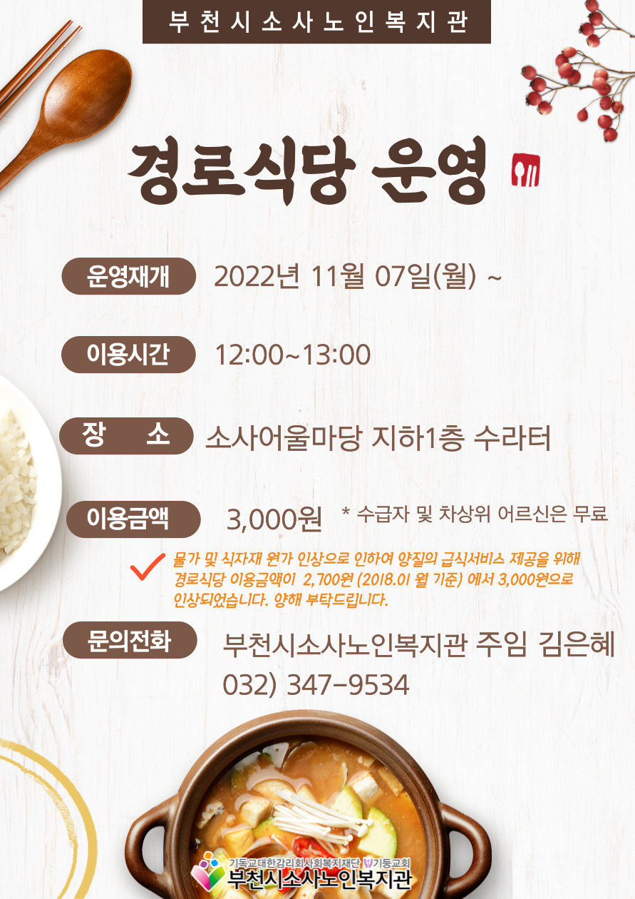 부천시소사노인복지관 경로식당을 11월 07일(월)부터 운영합니다.