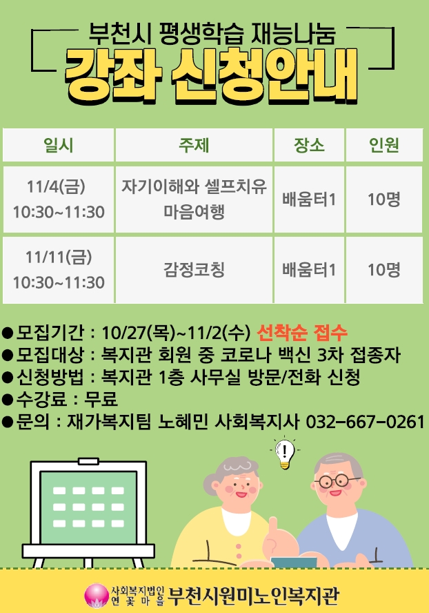 부천시원미노인복지관 평생학습 재능나눔 강좌 접수 안내