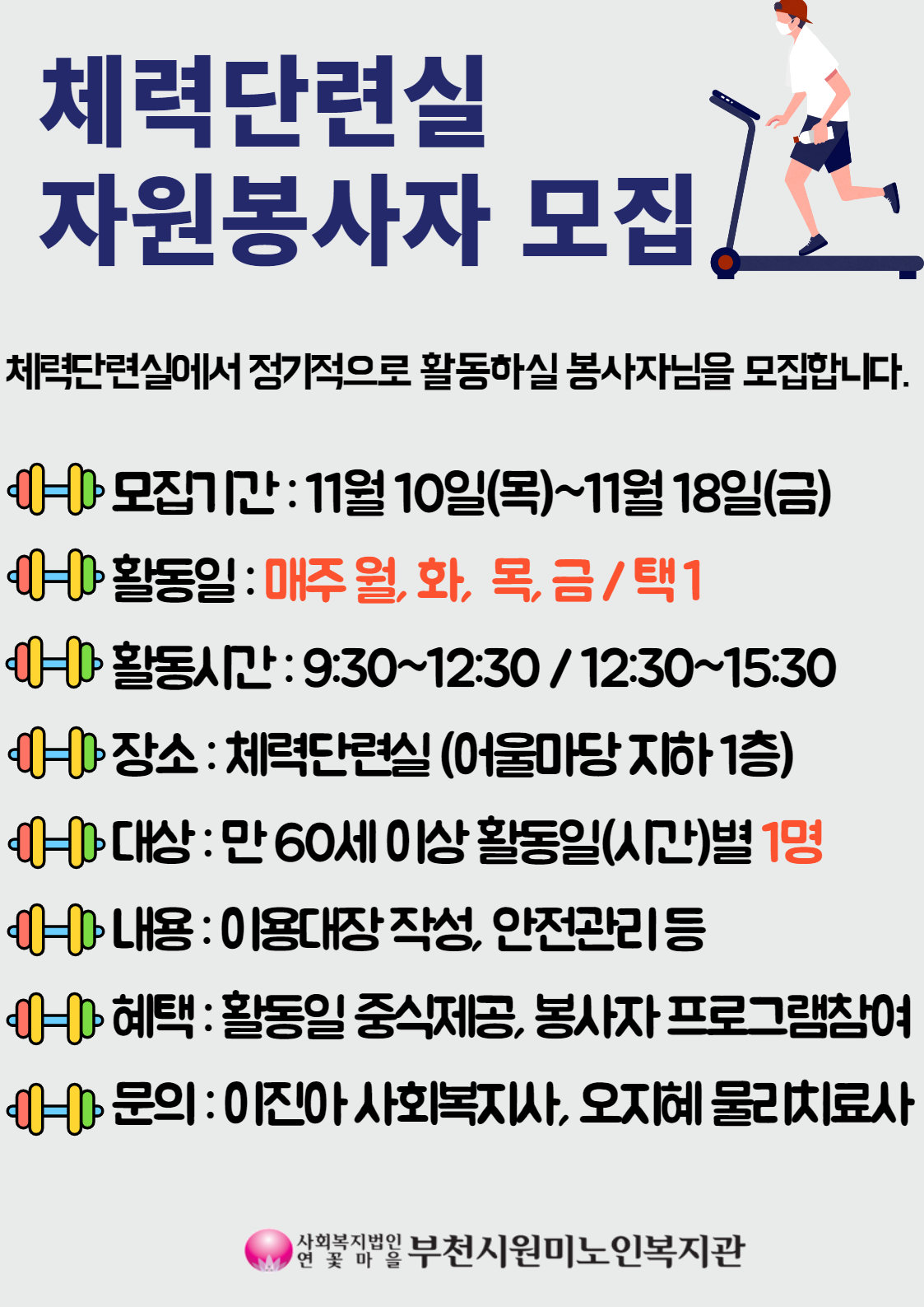 부천시원미노인복지관 체력단련실 자원봉사자 모집