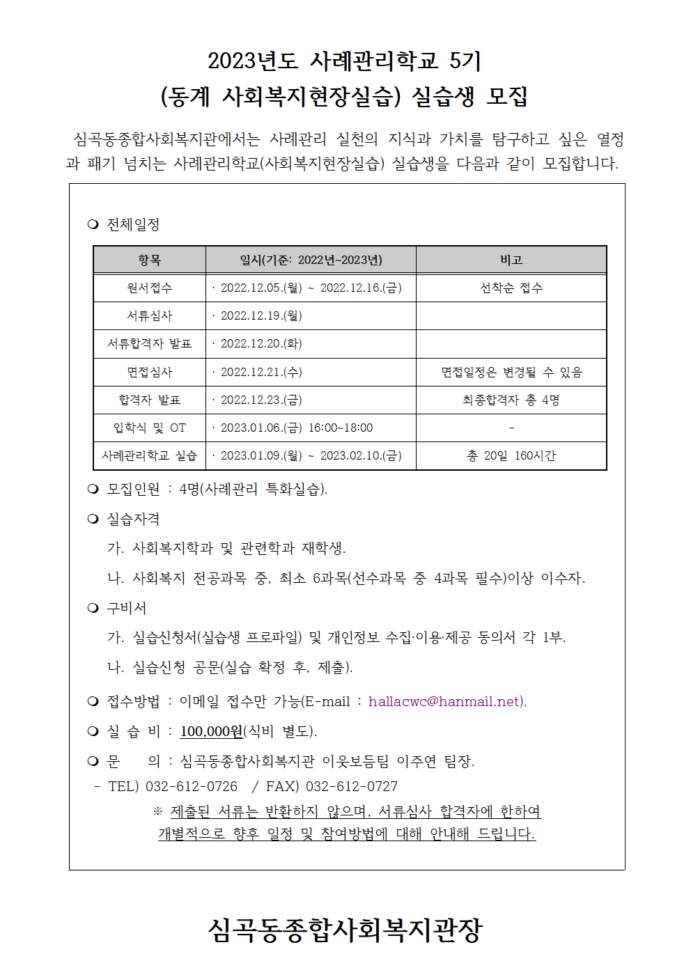 2023년도 사례관리학교 5기(동계 사회복지현장실습)실습생 모집