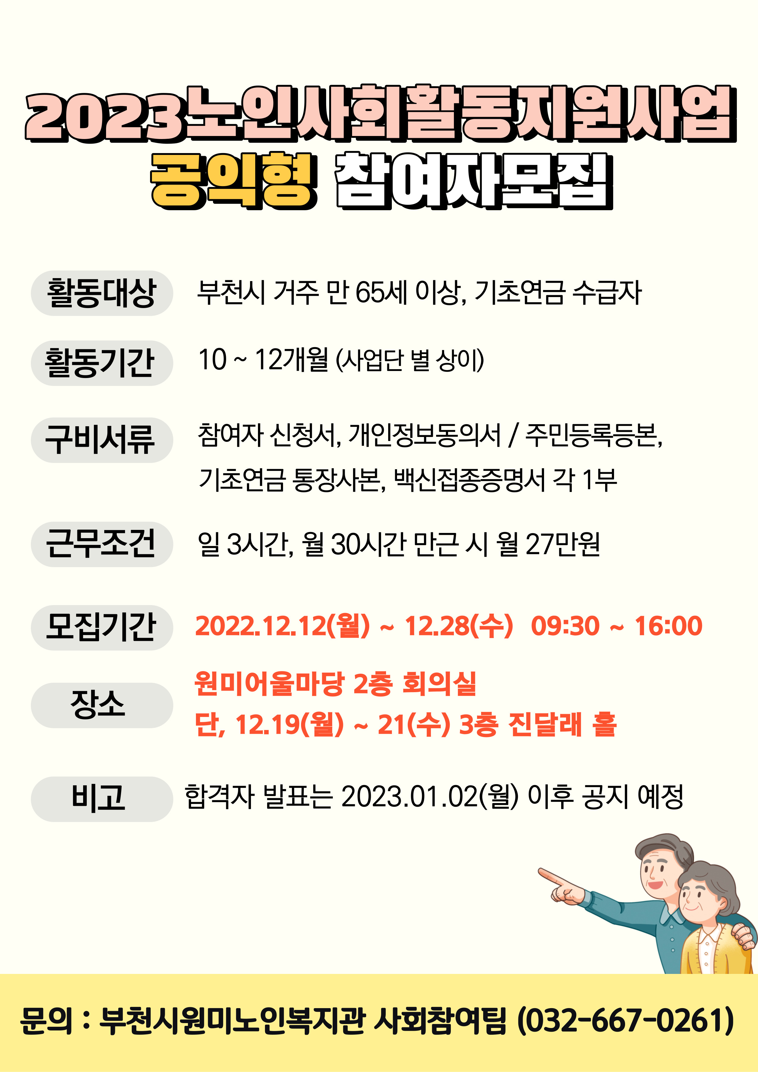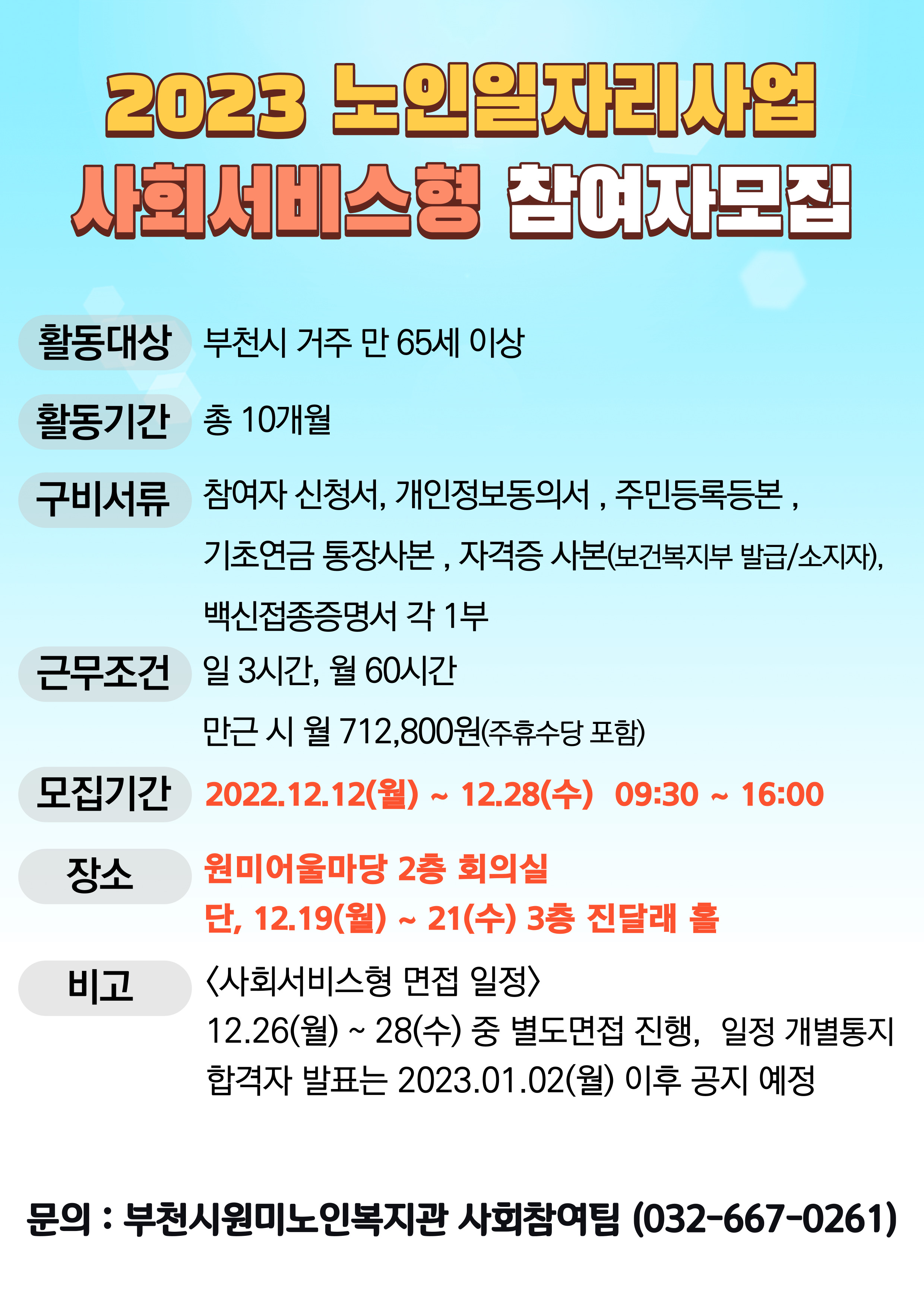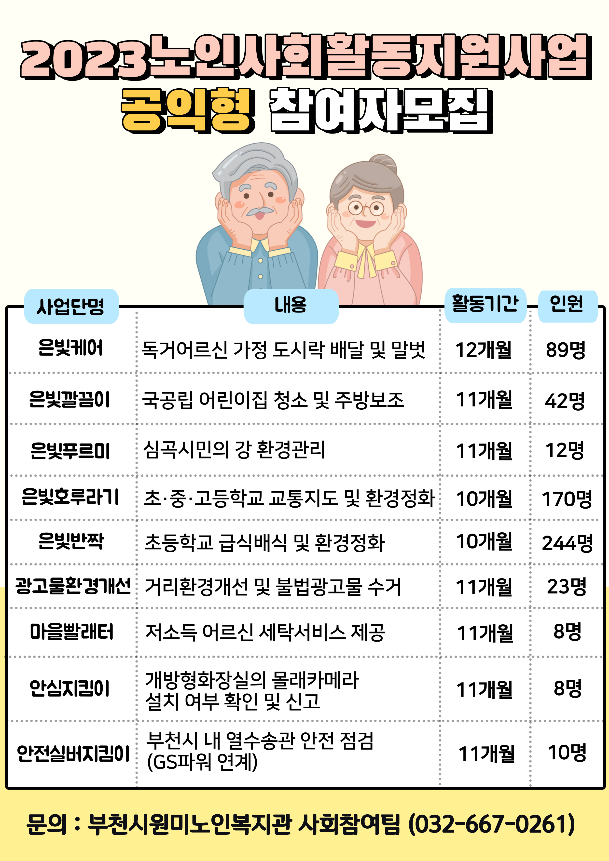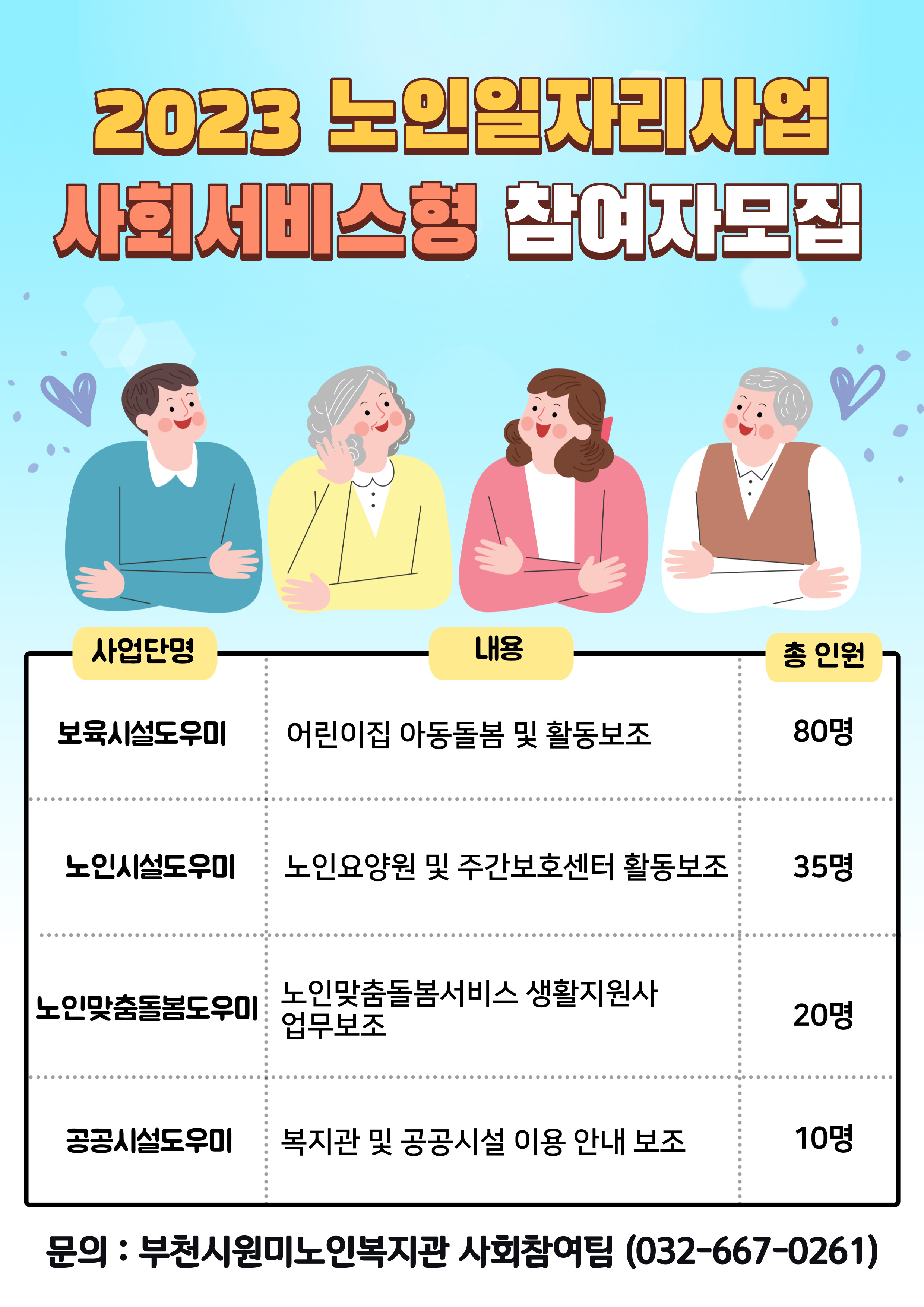 부천시원미노인복지관] 2023년 노인일자리 및 사회활동지원사업 참여자 모집