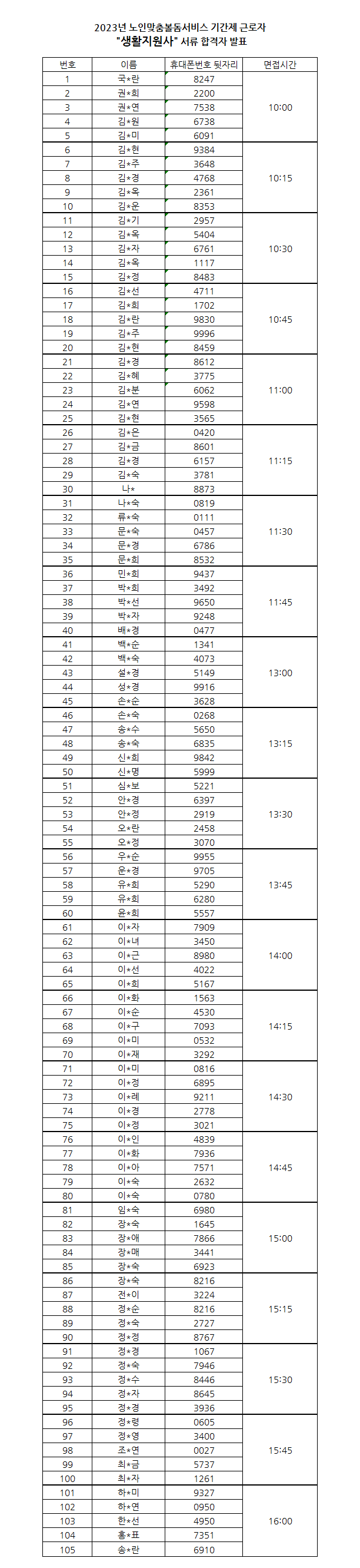● 개인정보보호를 위해 가운데 이름은 *처리하였으며, 합격자 확인은 휴대폰 뒷자리 번호로 확인하시기 바랍니다.
