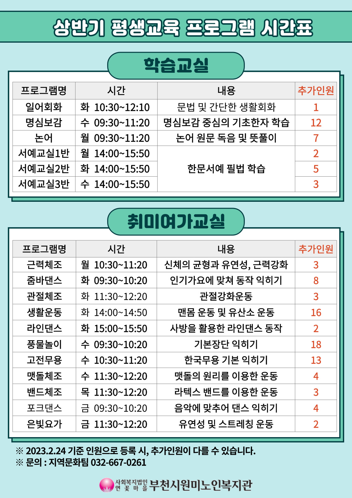 2023년 상반기 평생교육 프로그램 미달과목 추가등록을 진행합니다.