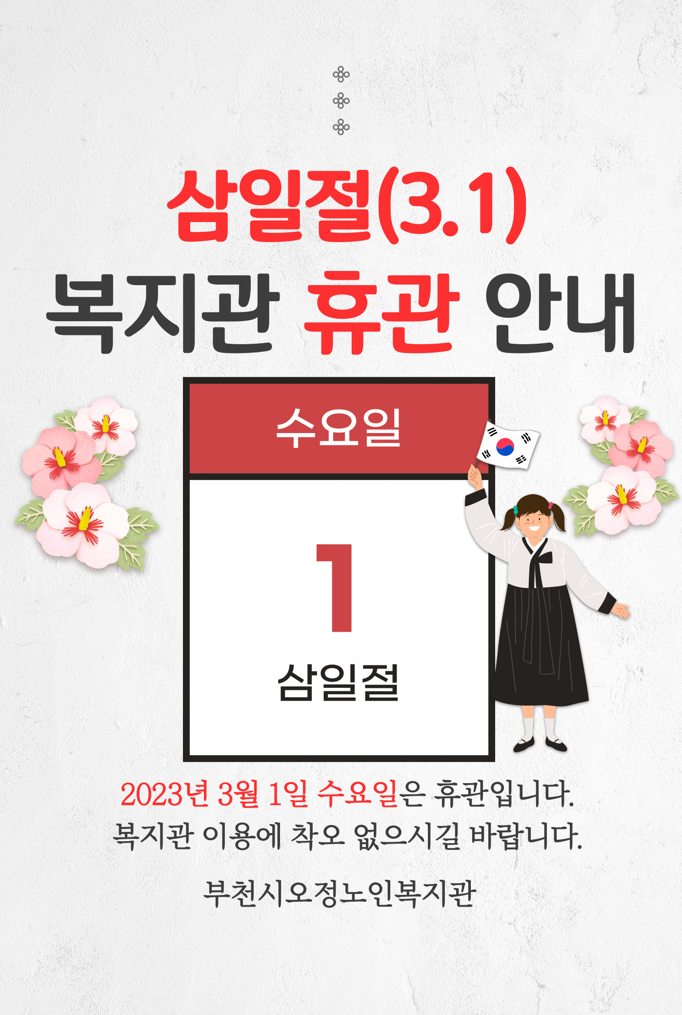 2023년 3월 1일 수요일 삼일절은 부천시오정노인복지관 휴관이오니, 복지관 이용에 참고하여 주시기바랍니다. ^^