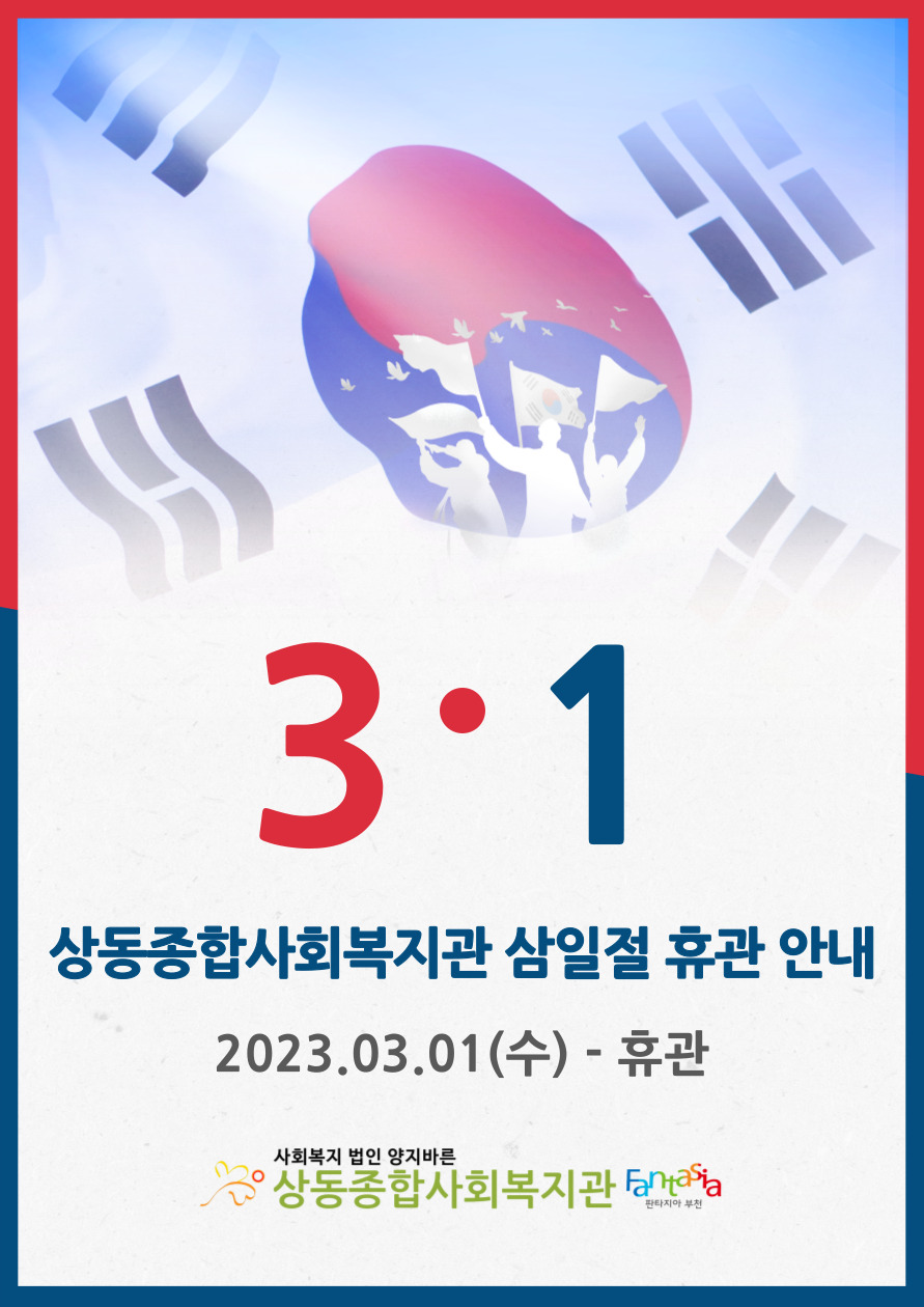 삼일절은 국가공휴일로 상동종합사회복지관도 휴관입니다.