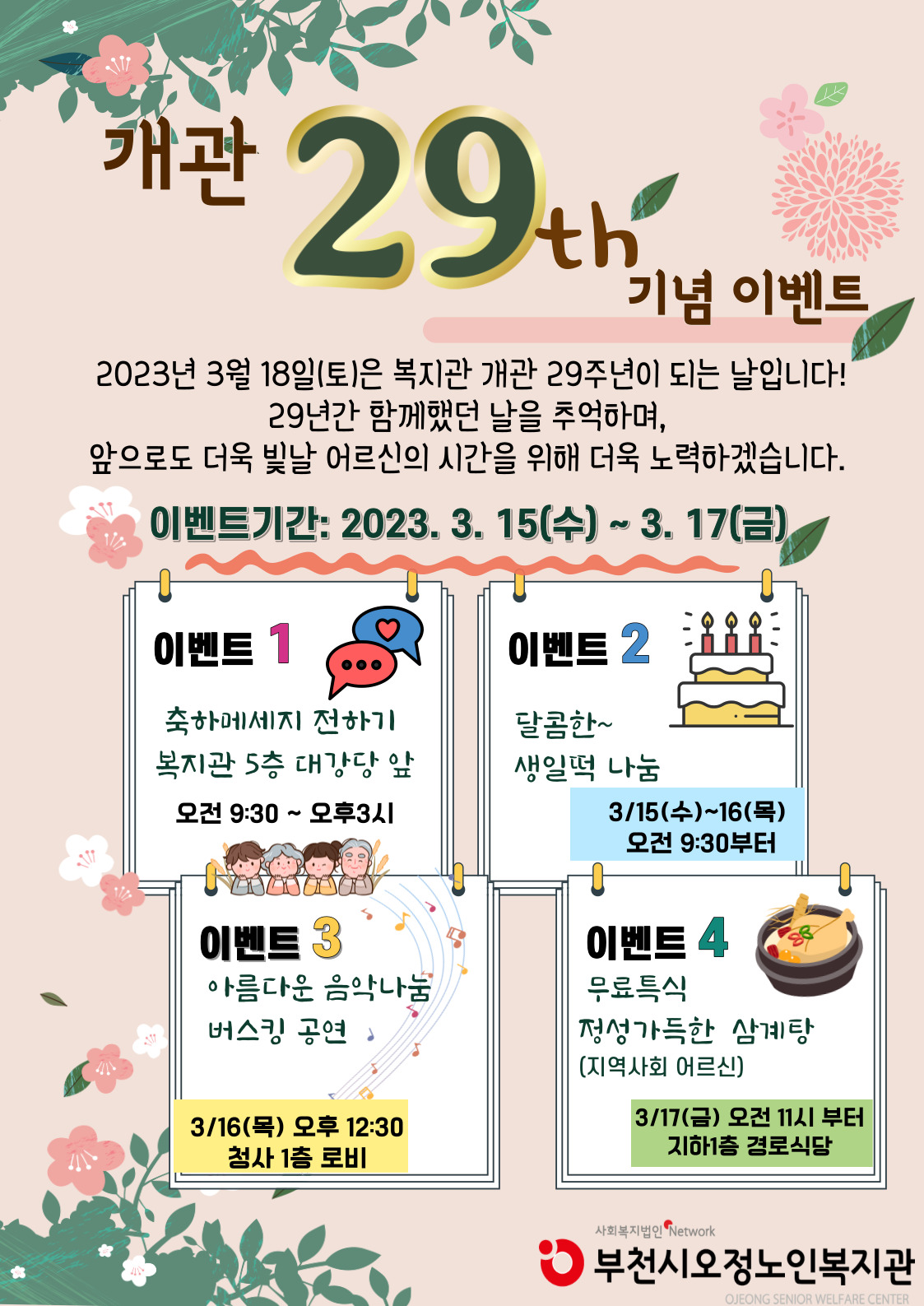 복지관 개관29주년을 맞이하여 3/15(수)~3/17(금) 이벤트가 진행됩니다.