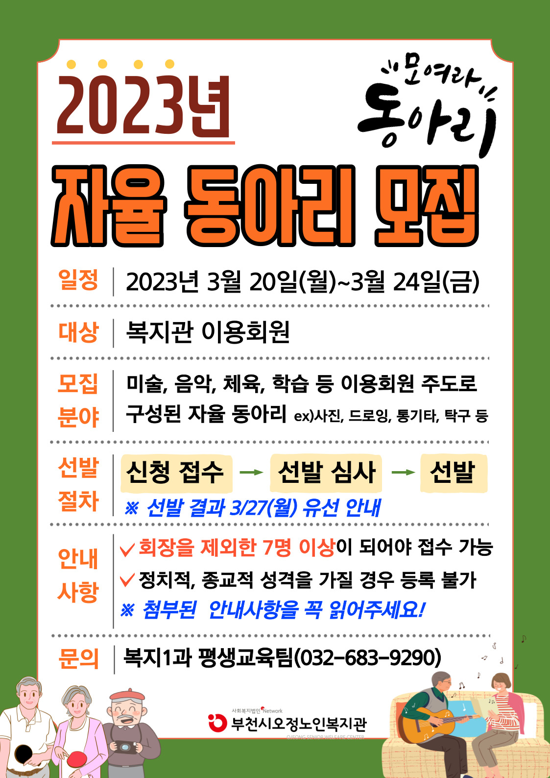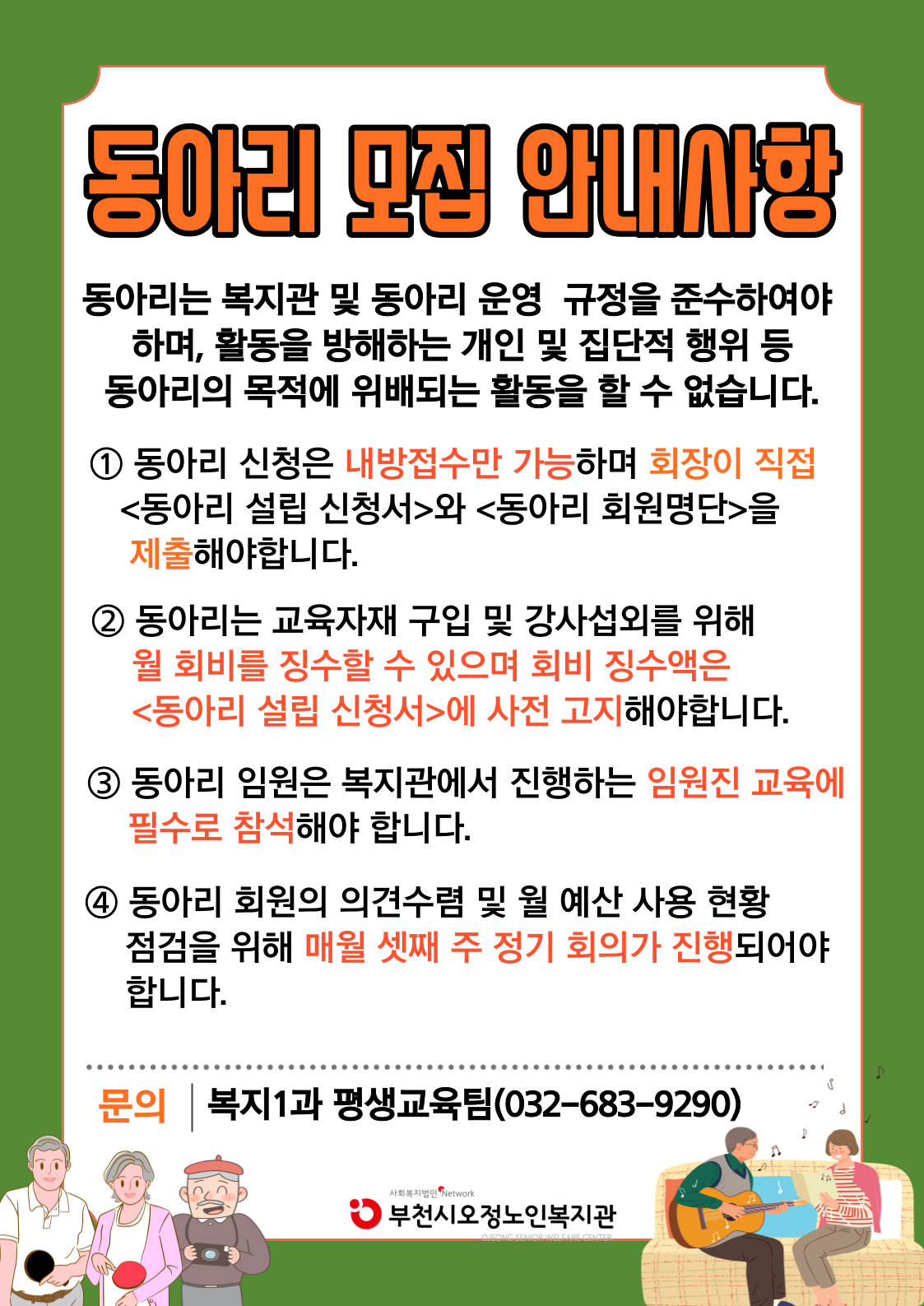 부천시오정노인복지관에서 어르신들의 활기찬 노후생활을 위한 자율 여가문화 동아리를 모집합니다.