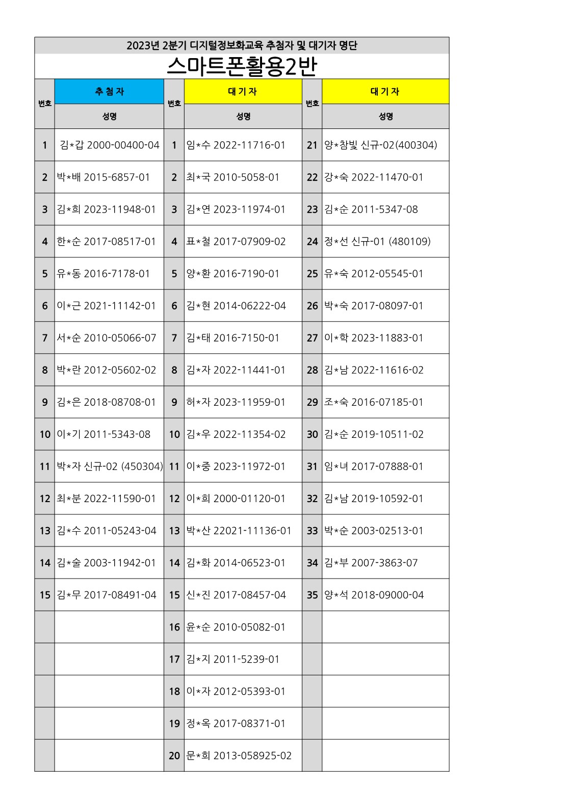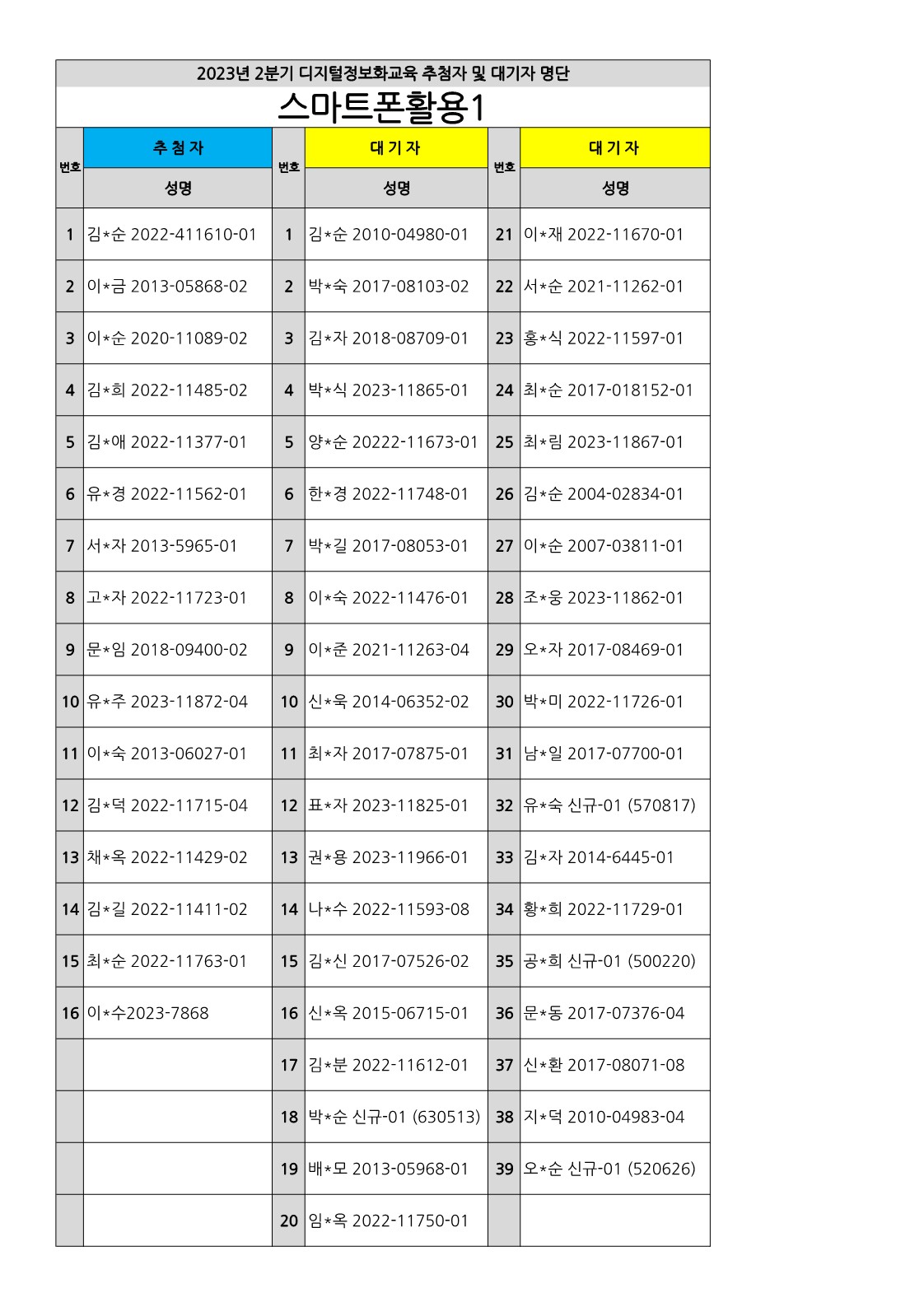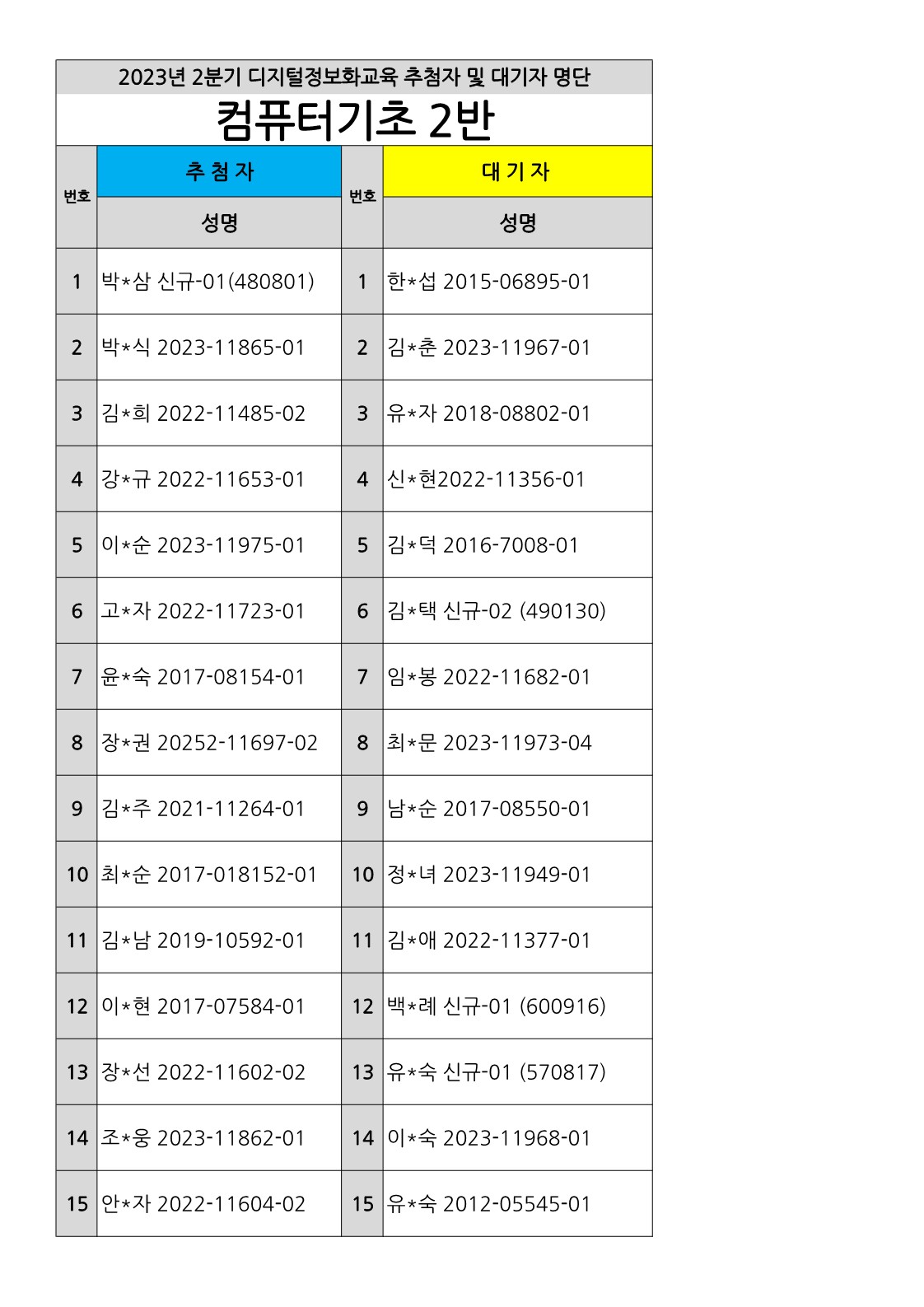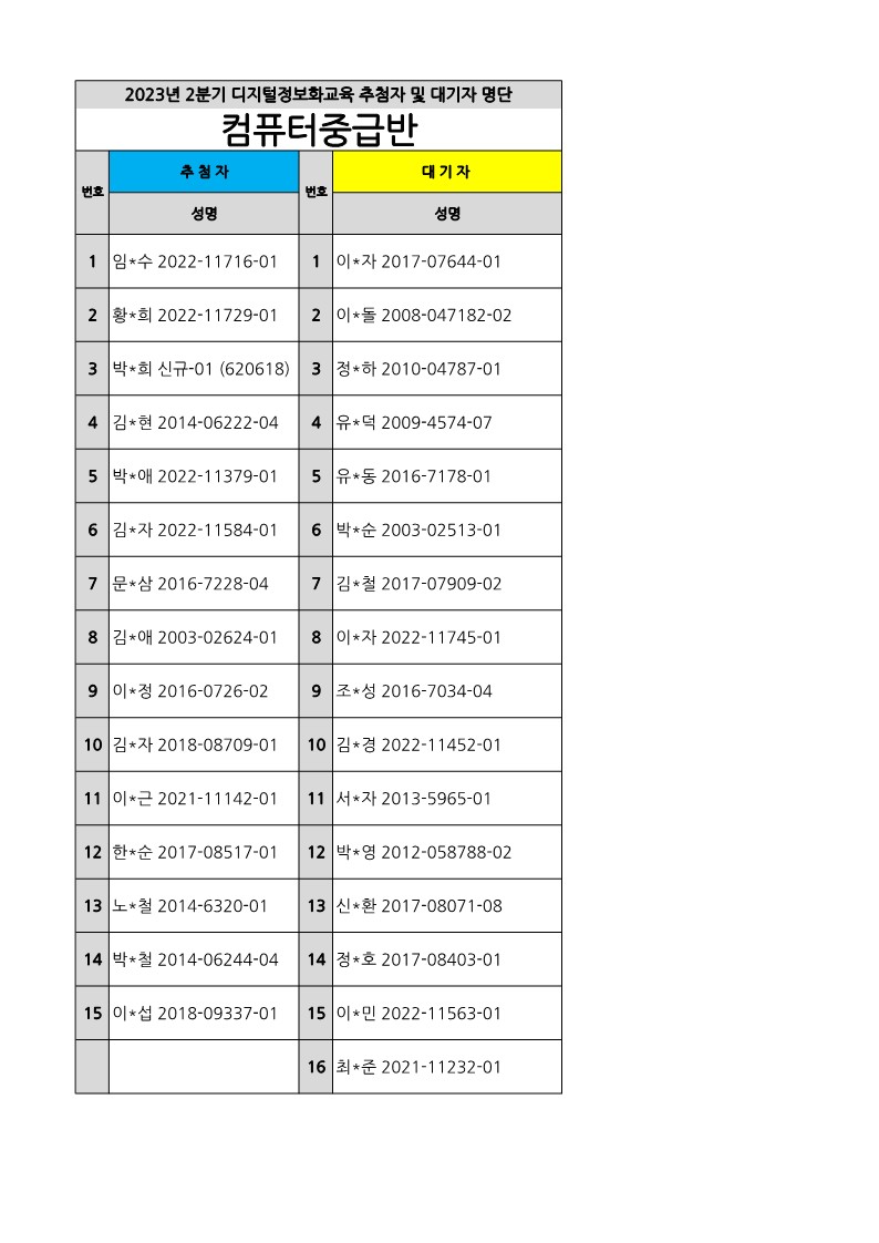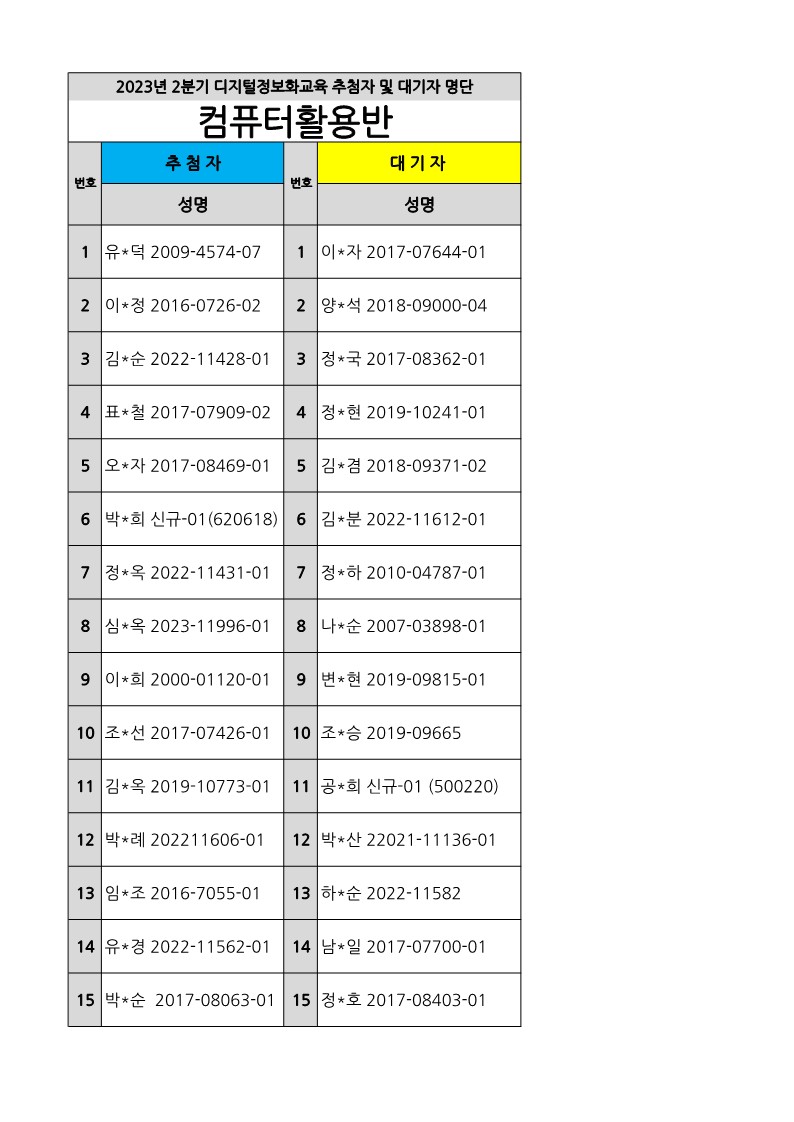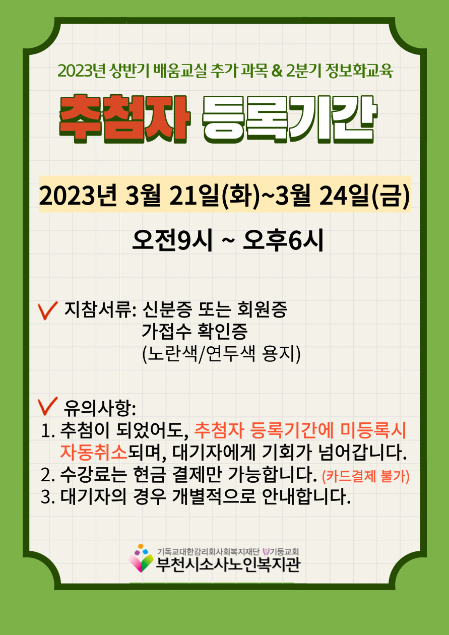 [부천시소사노인복지관] 2023년 상반기 배움교실, 2분기 정보화교육 추첨자 및 대기자 결과 확인
