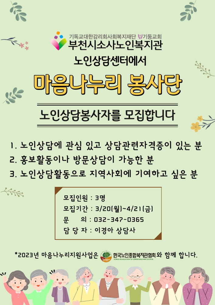 소사노인상담센터 마음나누리 노인상담봉사자 모집