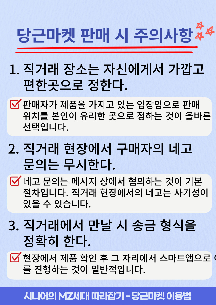 * 당근마켓 물품 판매 시 주의해야할 점이 마지막장에 안내되어 있으니 읽어 보시고 안전하게 이용하기 바랍니다.