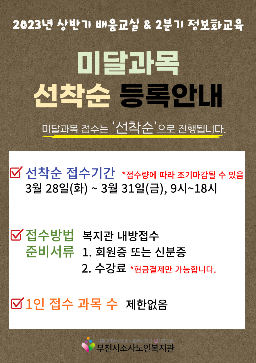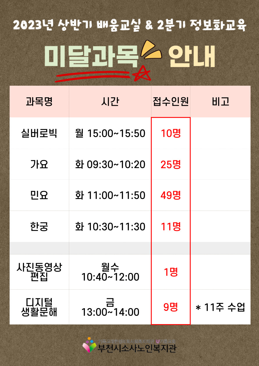 2023년 상반기 배움교실 추가 과목&2분기 정보화교육 미달과목 선착순 접수 안내