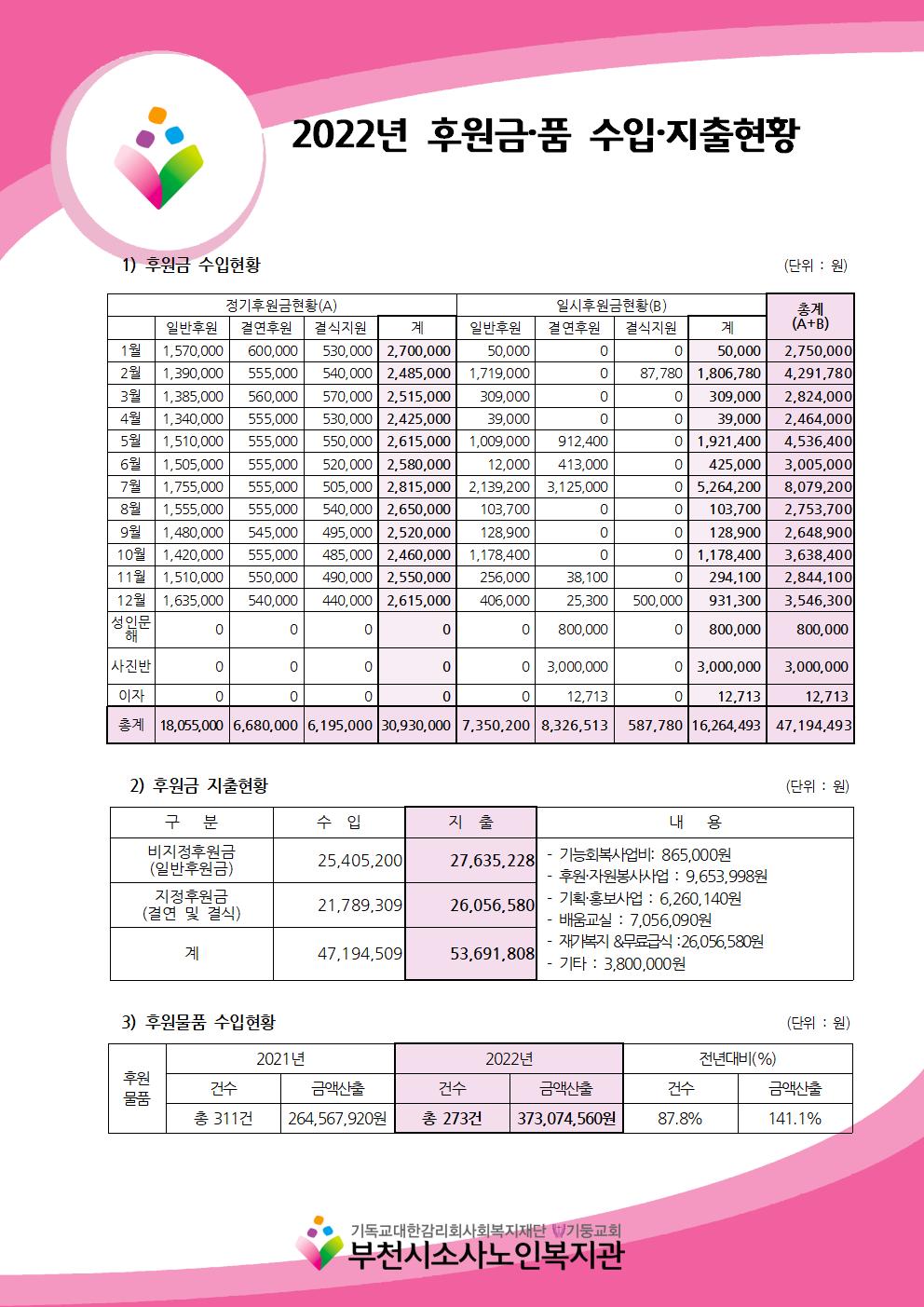 [후원자관리사업] 부천시소사노인복지관 2022년 후원금(품) 수입/지출 보고