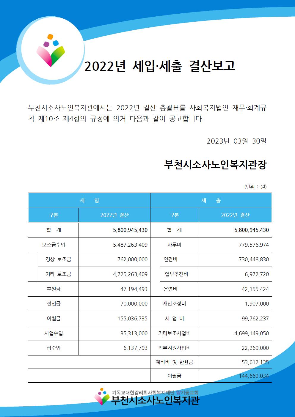 [부천시소사노인복지관] 2022년 세입·세출 결산보고