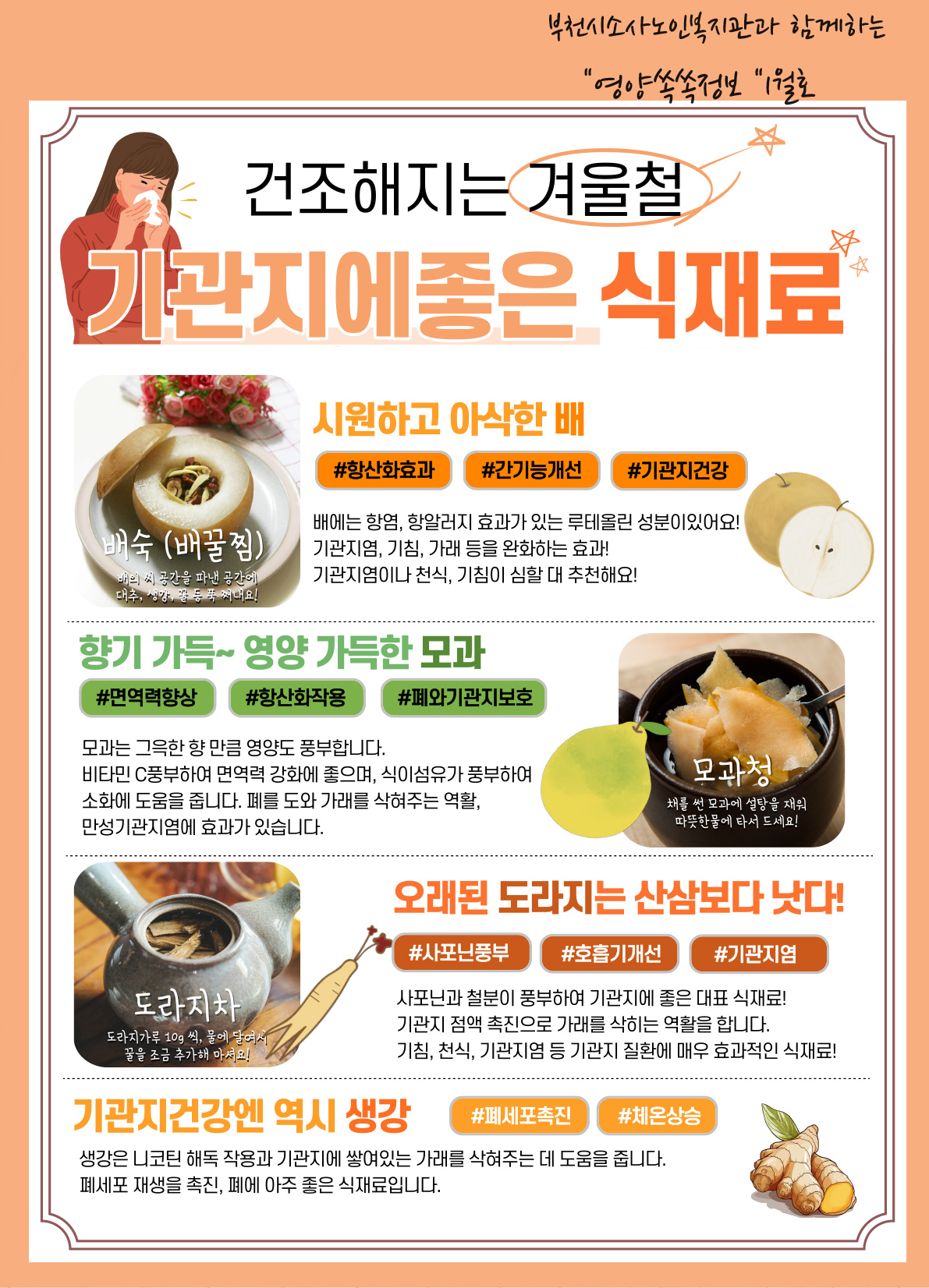 부천시소사노인복지관과 함께하는 "영양쏙쏙정보" 1월호는 건조하고 추운 겨울철 기관지에 좋은 식재료를 소개합니다.