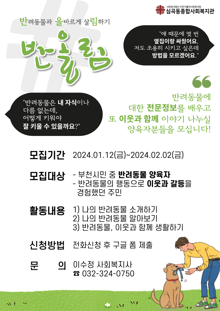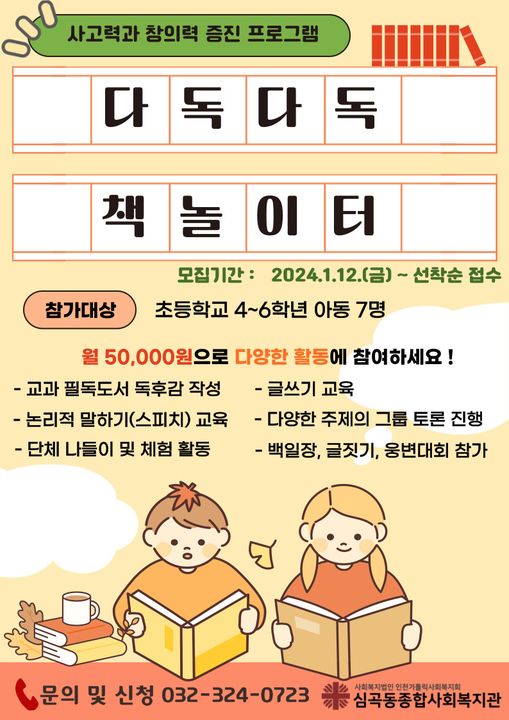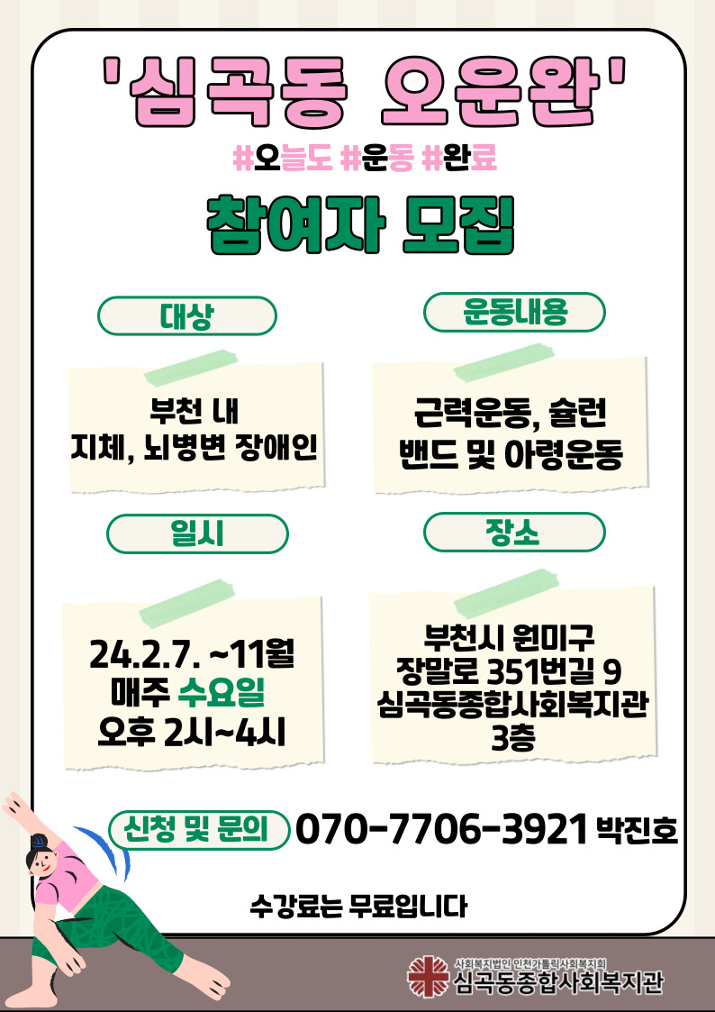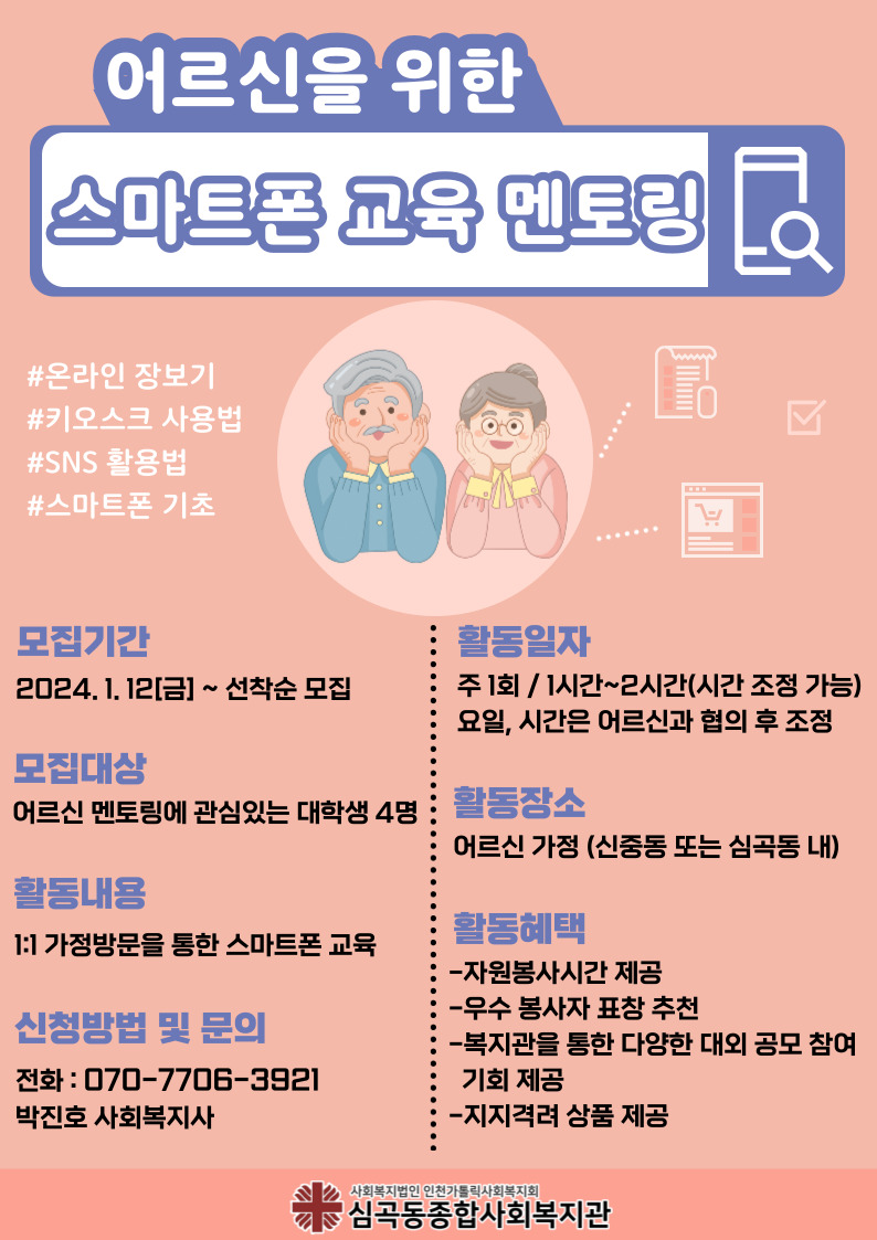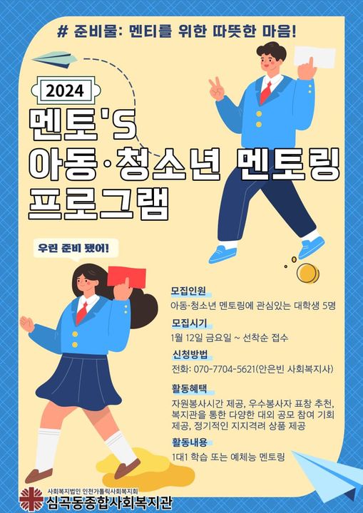 안녕하세요. 심곡동종합사회복지관 2024년 프로그램 참여자와 멘토를 모집하고 있습니다.