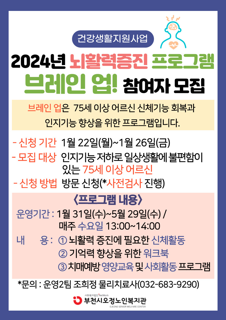 2024년 뇌활력증진 프로그램 브레인 업은 인지기능저하로 인해 일상생활에 어려움이 있는 회원을 대상으로 진행하는 인지기능향상 프로그램입니다.