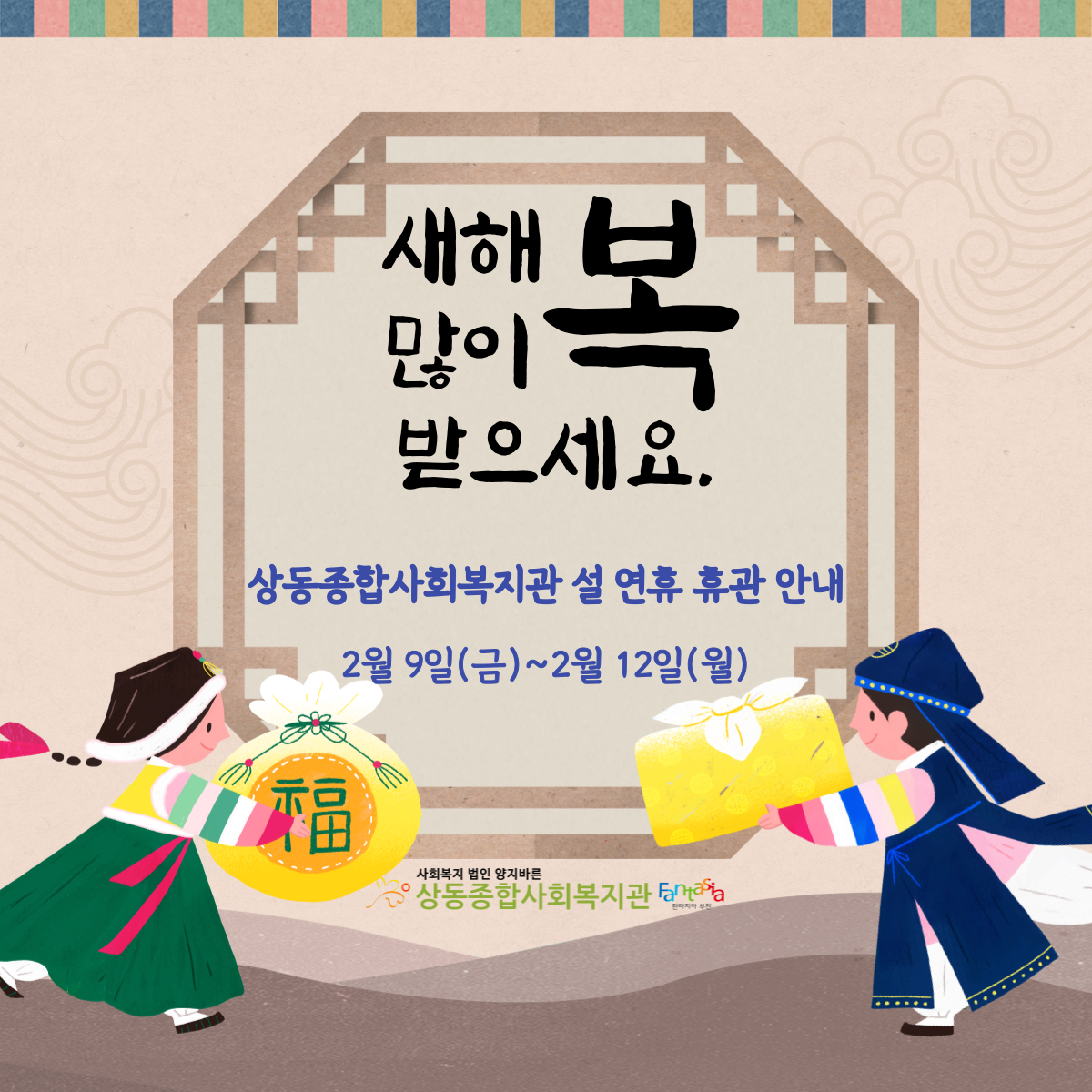 복지관이 설 연휴를 맞아 2월 9일(금)~2월 12일(월)까지 휴관합니다.