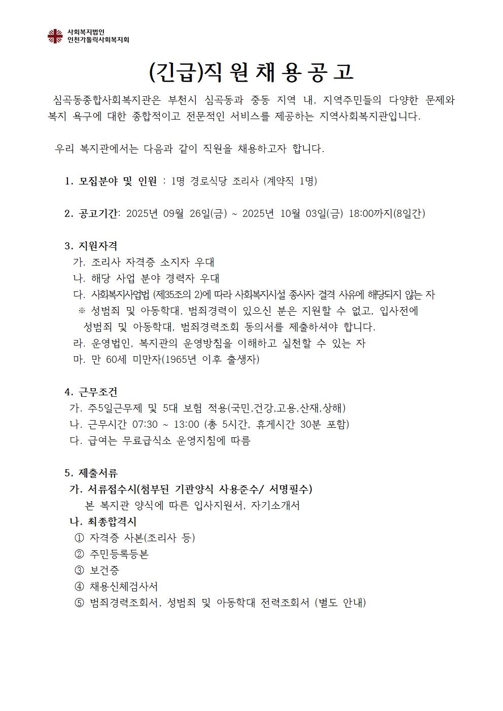 (긴급)심곡동종합사회복지관 직원채용(무료급식소 취사원) 총1명_재공고
