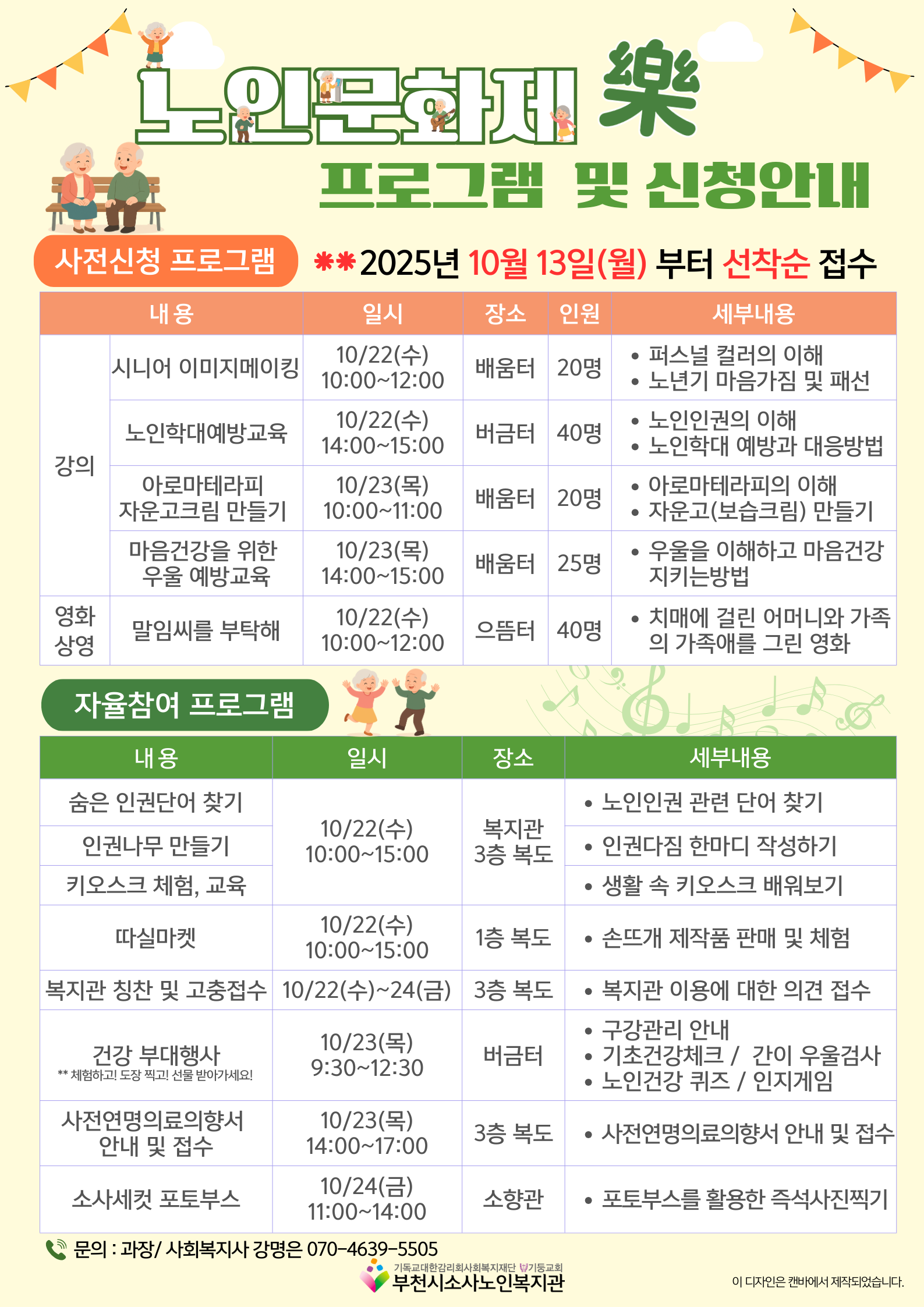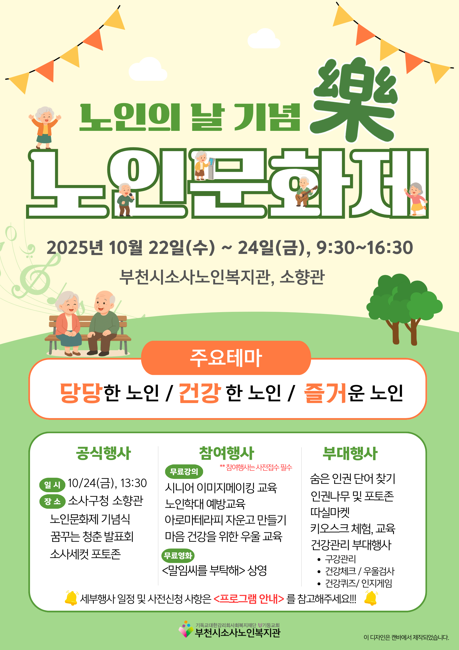 부천시소사노인복지관에서는 노인의 날을 맞이하여 어르신들과 함께하는 '노인문화제 樂'을 진행합니다! 어르신들의 많은 관심과 참여 부탁드립니다😊