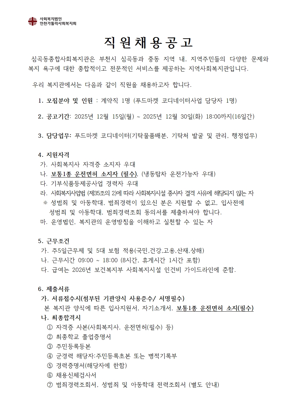 심곡동종합사회복지관 직원채용(푸드마켓 코디네이터 1명)