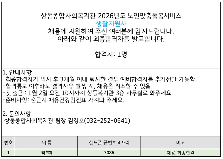 2026년도 노인맞춤돌봄서비스 생활지원사(계약직) 채용 결과 안내