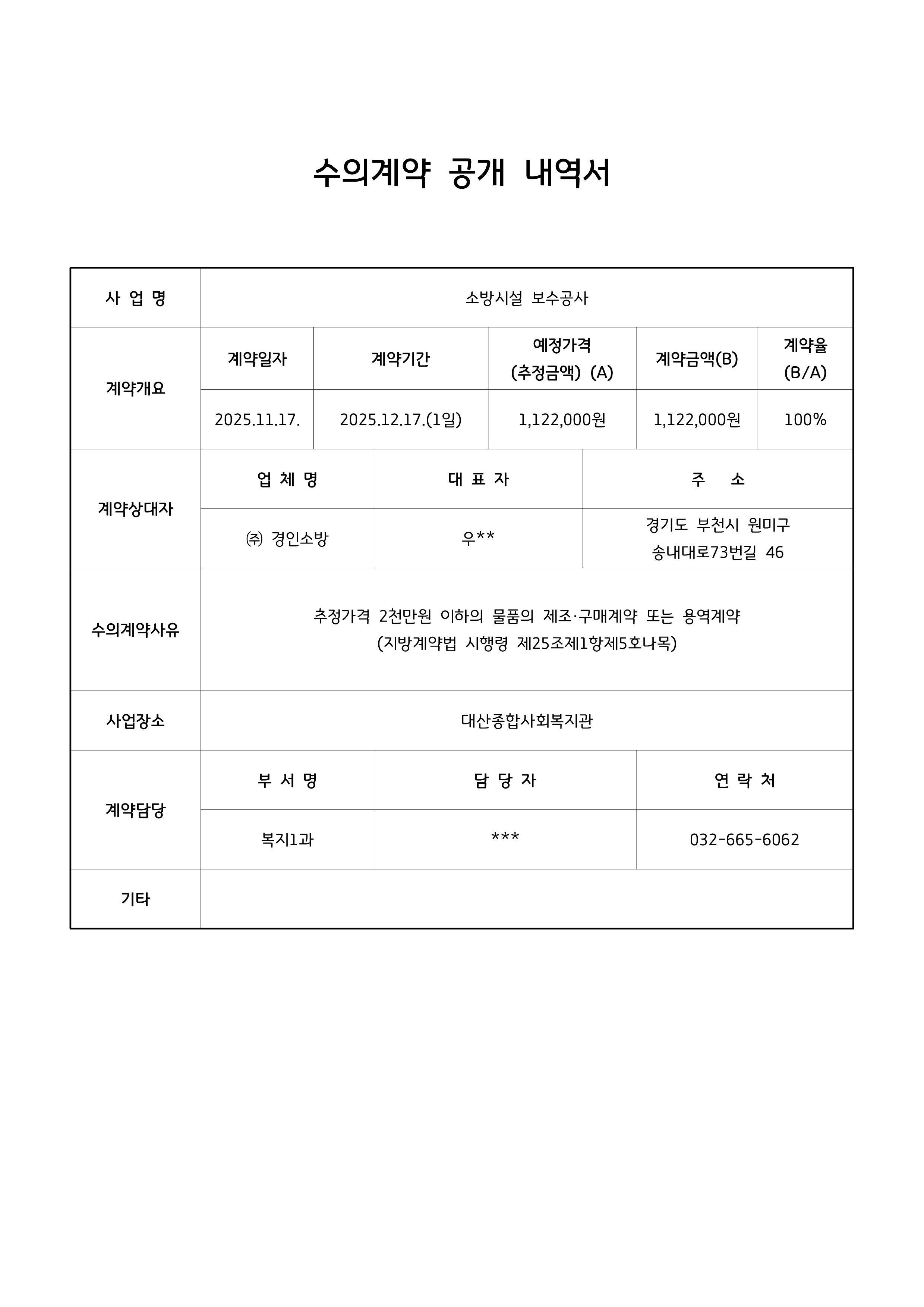 대산종합사회복지관 수의계약 내역 공개(소방시설 보수공사)
