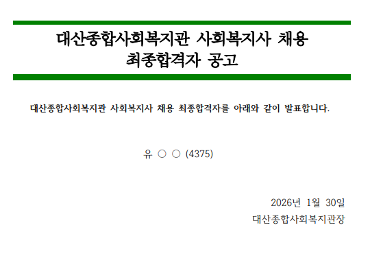 대산종합사회복지관 사회복지사 채용 최종합격자 공고