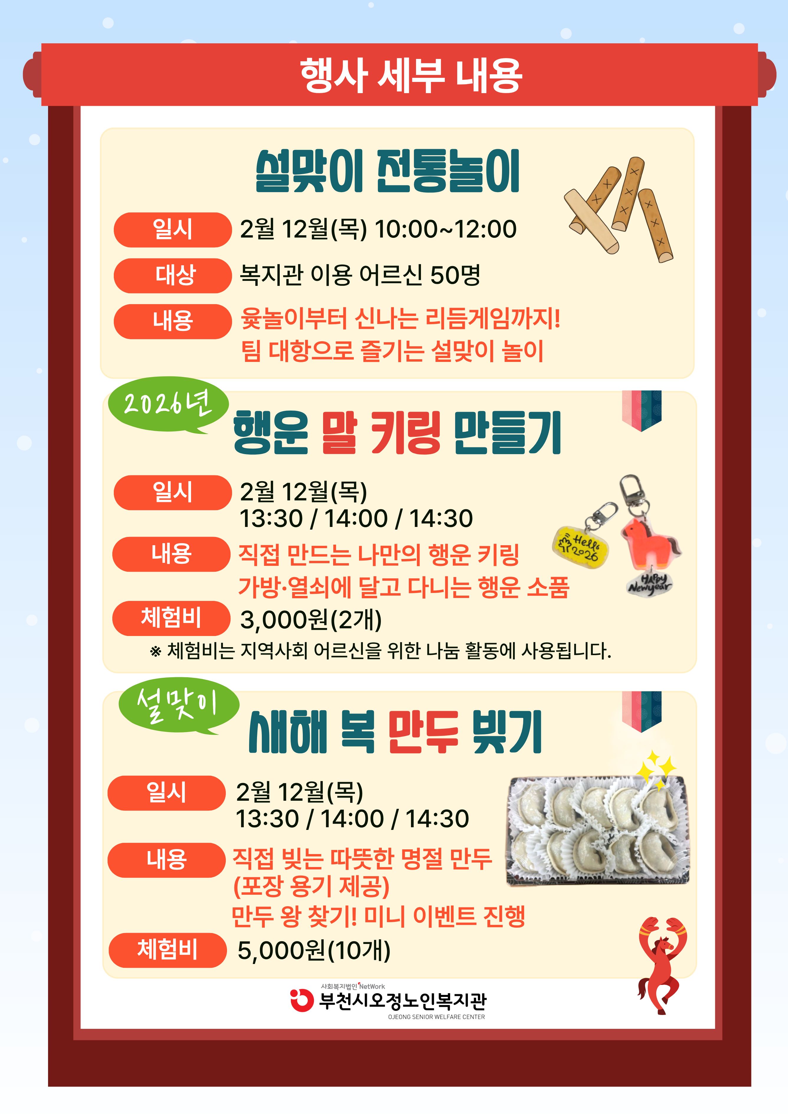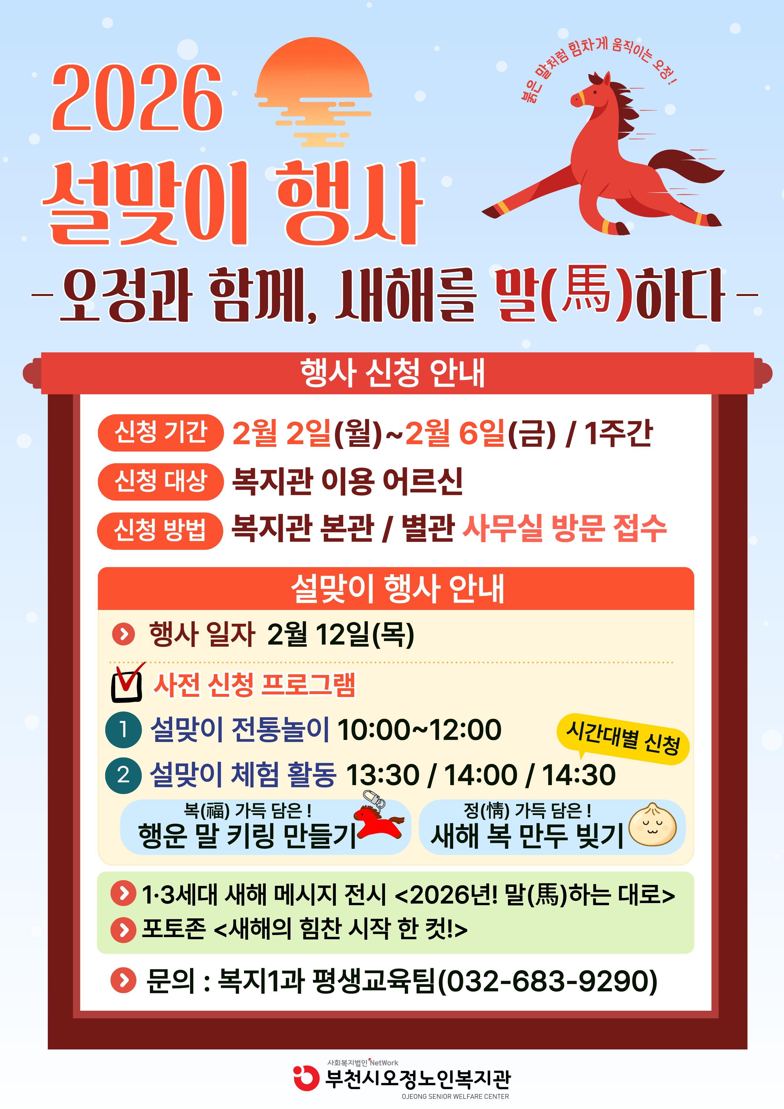 부천시오정노인복지관에서는 2/12(목)! 2026년 평생교육 설행사<오정과 함께, 새해를 말(馬)하다>를 진행합니다. 전통놀이, 체험활동 사전 신청은 2/2월(월)~2/6(금) 접수하오니, 많은 관심바랍니다! ❤️함께라서 더 따뜻한 새해, 웃음과 정이 가득한 설날! 오정에서 만나요❤️ <행사 신청 안내> - 신청 기간 : 2월 2일(월)~2월 6일(금) / 1주간 - 신청 대상 : 복지관 이용 어르신 - 신청 방법 : 복지관 본관 / 별관 사무실 방문 접수 <설맞이 행사 안내> - 행사 일자 : 2월 12일(목) - 행사 프로그램 1. 설맞이 전통놀이 2. 설맞이 체험활동<행운 말 키링 만들기> 3. 설맞이 체험활동<새해 복 만두 빚기> 4. 1·3세대 새해 메시지 전시 5. 2026년 포토존 ※ 문의 : 복지1과 평생교육팀(032-683-9290)