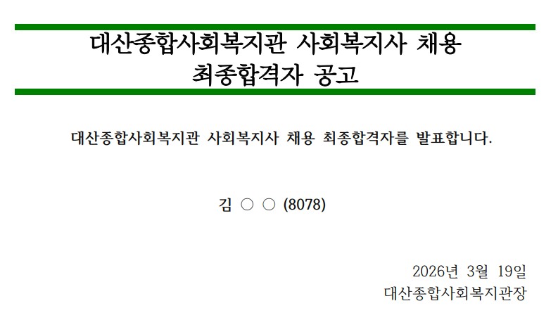 대산종합사회복지관 사회복지사 채용 최종합격자 공고