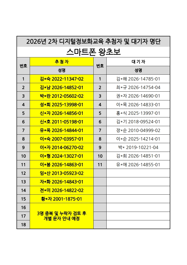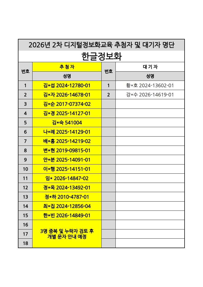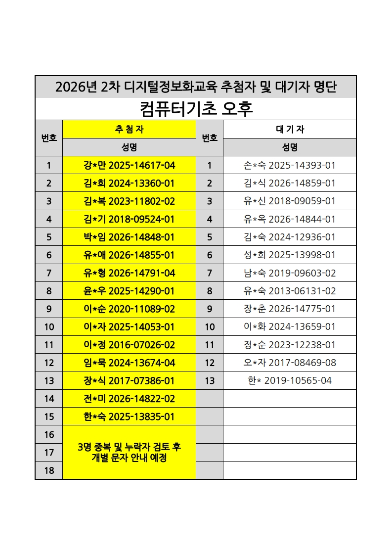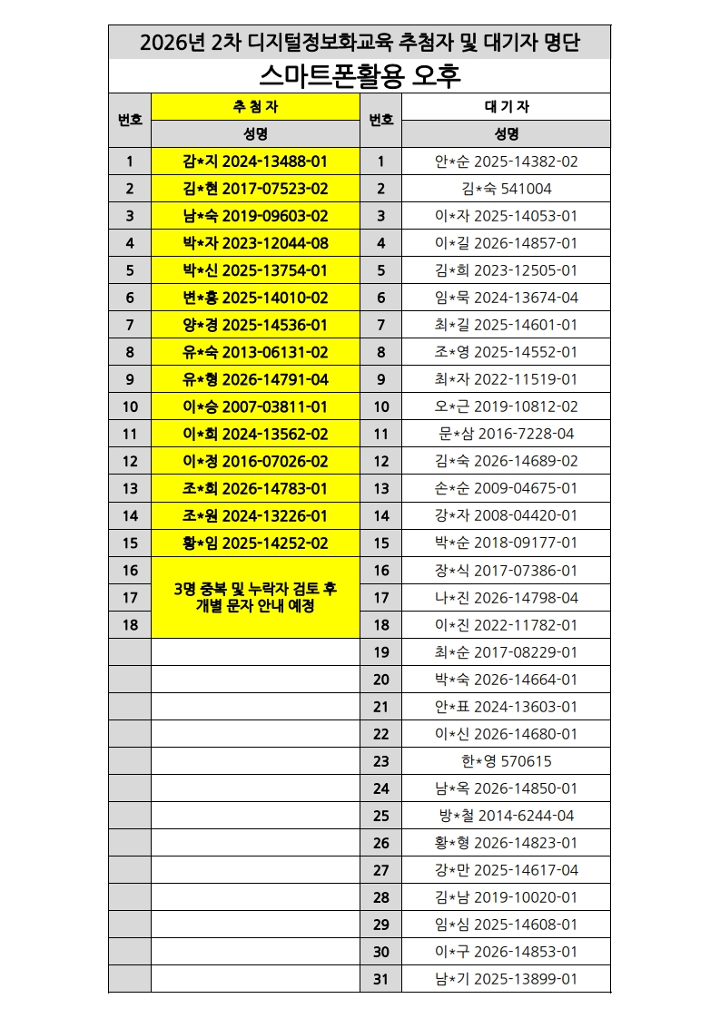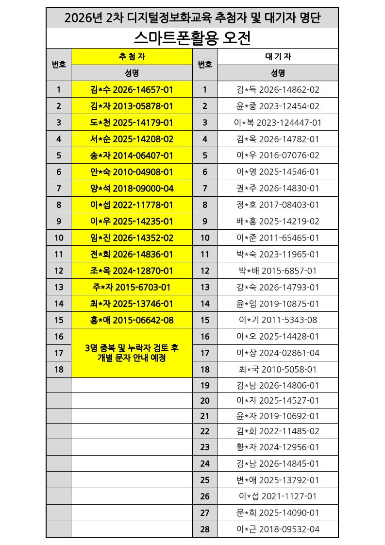 [노년사회화교육사업] 2026년 2차 디지털정보화교실 추첨자 및 대기자 명단