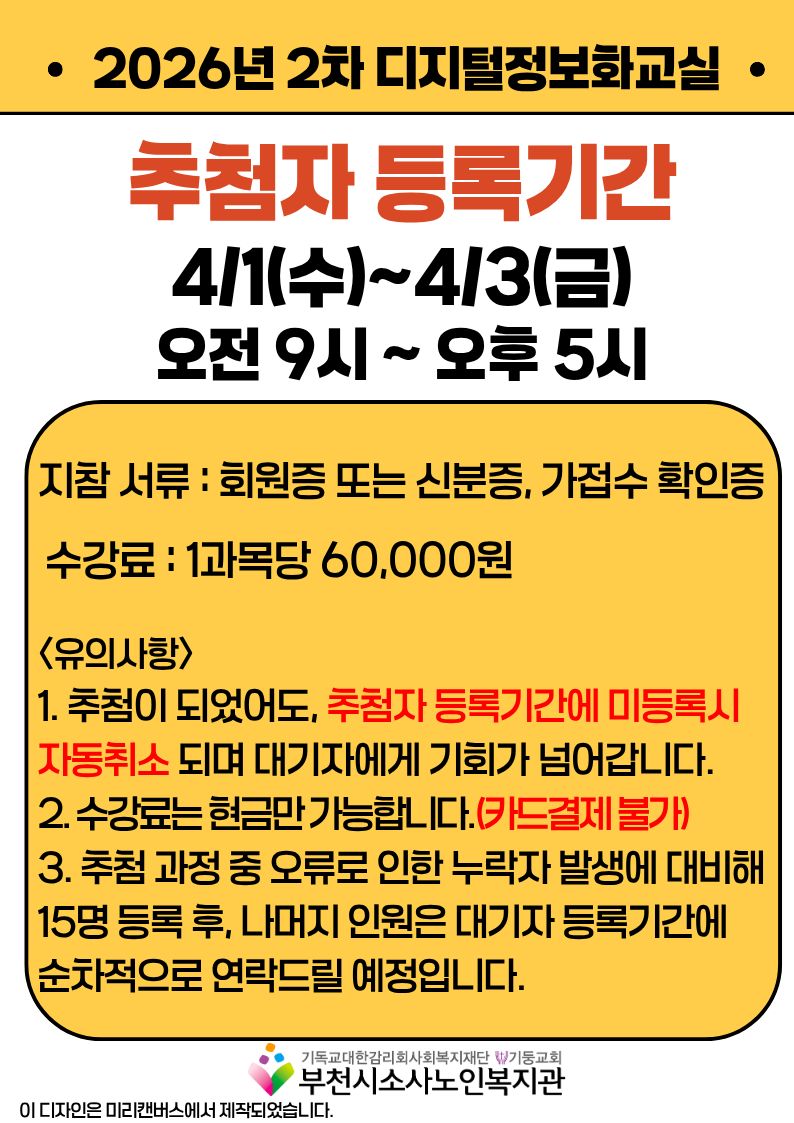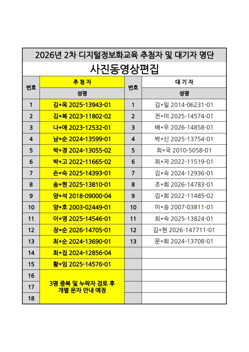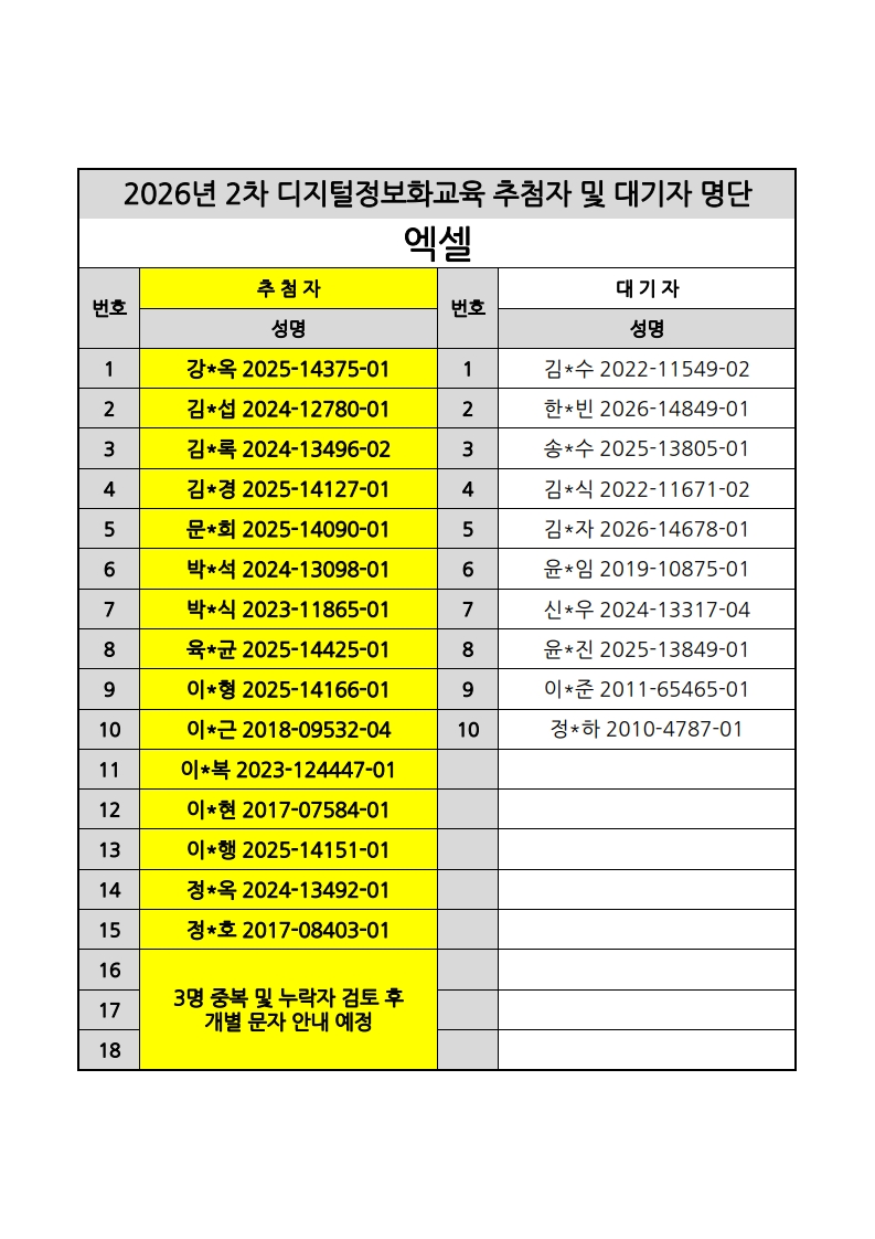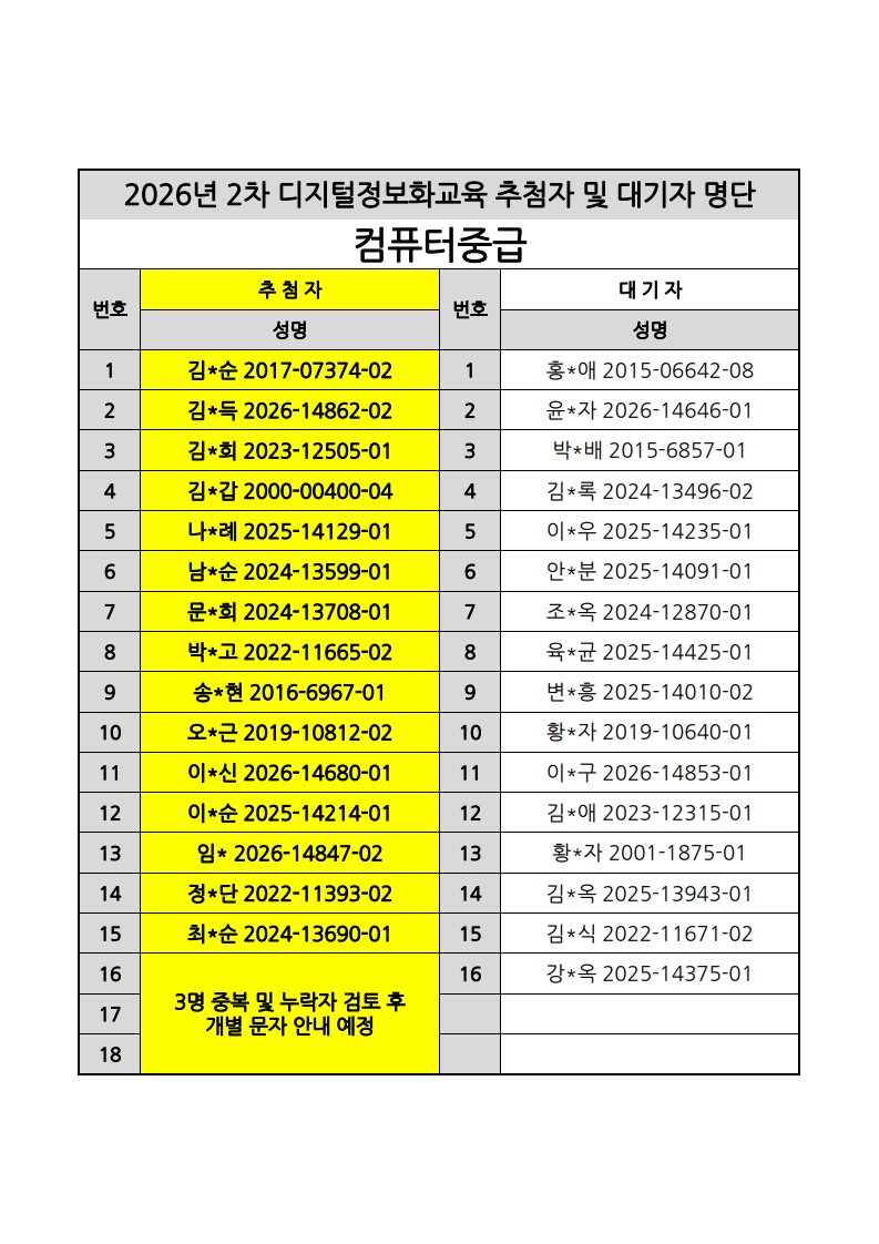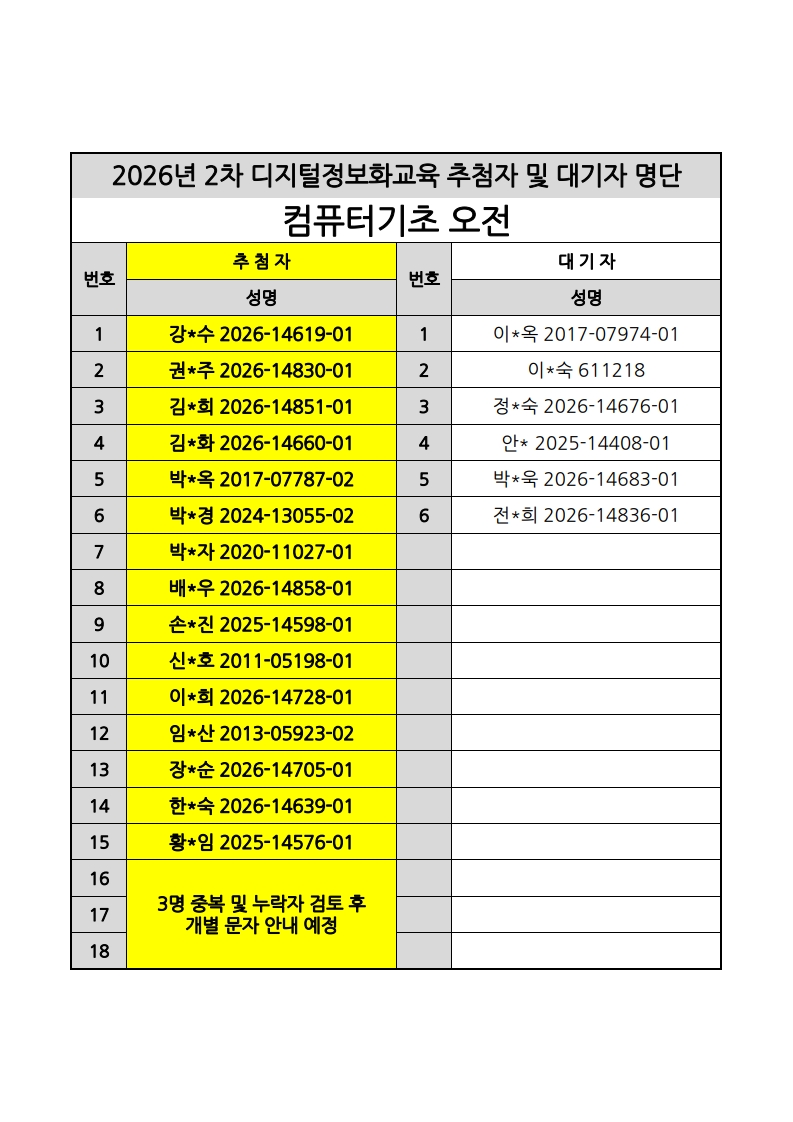 [노년사회화교육사업] 2026년 2차 디지털정보화교실 추첨자 및 대기자 명단
