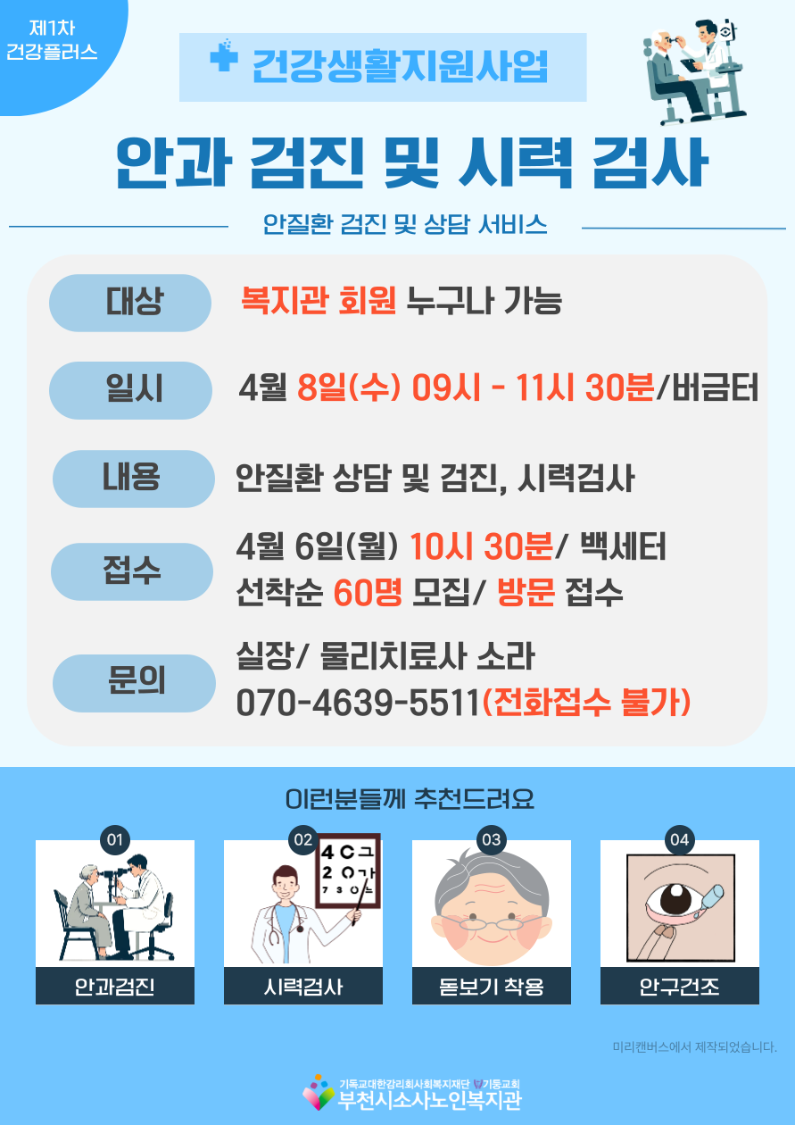 부천시소사노인복지관 건강생활지원사업에서는 어르신들의 눈 건강 증진을 위해 안과 검진 및 시력 검사를 실시합니다.