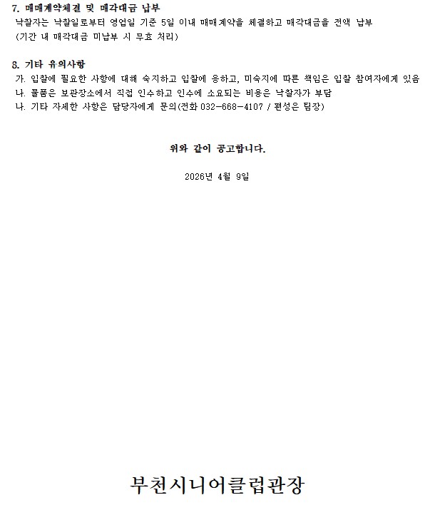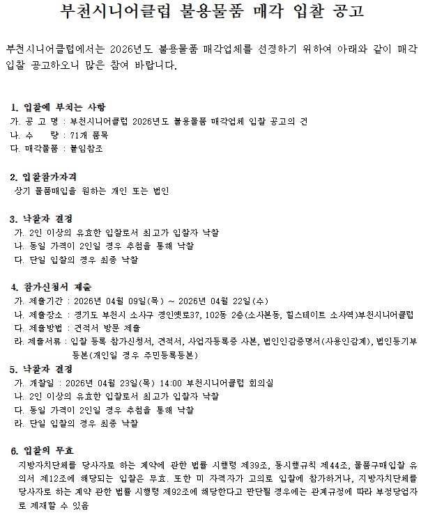 2026년도 부천시니어클럽 불용물품 매각 입찰 공고